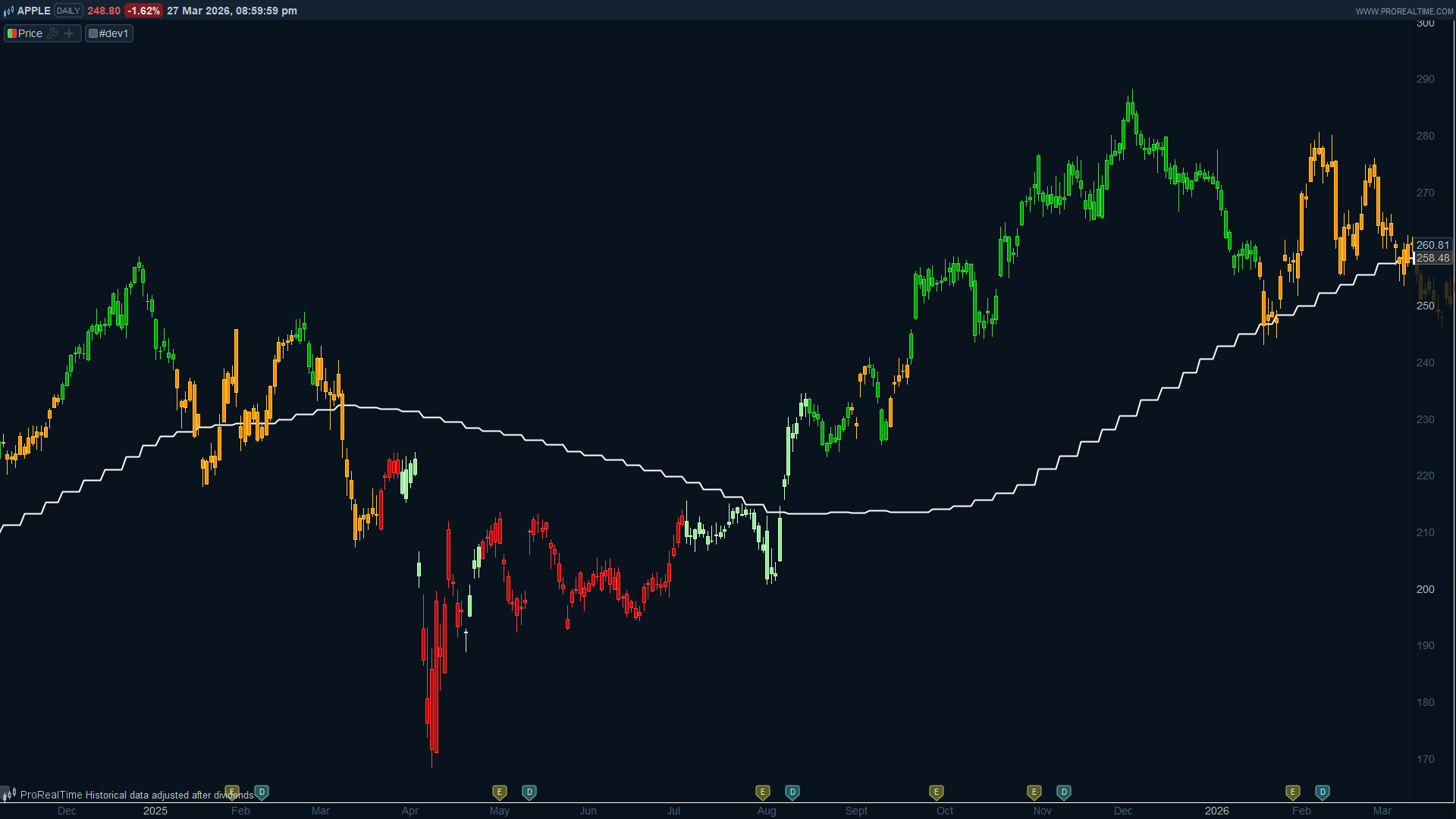 This indicator brings Stan Weinstein’s Stage Analysis methodology into ProRealTime using native ProBuilder code. It colors each candle on your chart according to the current Weinstein stage, calculated from weekly price data and a weekly simple moving average. The result is a quick visual read of where an instrument sits in its long-term market cycle, without having to switch to a weekly chart.