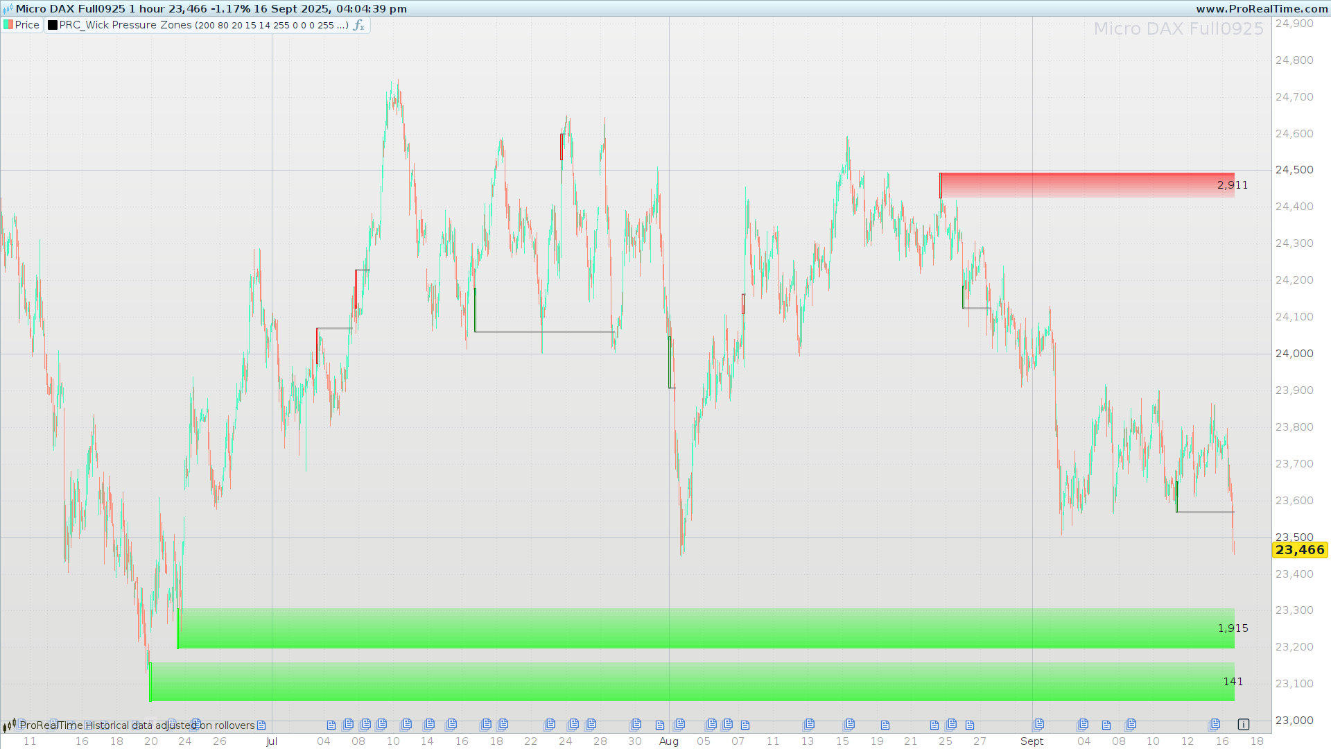 Wick Pressure Zones (by Bigbeluga) solves this by transforming unusually large wicks into objective supply/demand areas. It normalizes each wick against the largest wick observed in a rolling window, applies a simple RSI regime filter for context, and then draws and extends those zones forward until price fully clears them. The result is a clean, rules‑based map of where pressure concentrated—and how the market later reacts on retests or breaks.