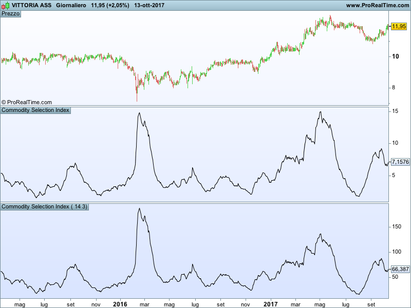 Welles Wilder introduced the CSI (Commodity Selection Index) in his bestseller “New concepts in technical trading” and uses this indicator to screen the commodities that are “strong” enough to be traded with a trend following system. The bigger the CSI the stronger the trend.