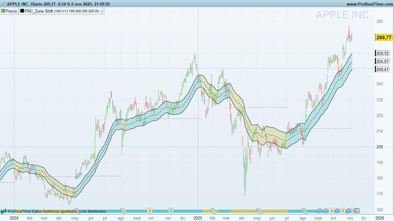 In an established trend, pullbacks toward the Middle can act as dynamic mean reversion spots for continuation, especially when the regime color remains intact.