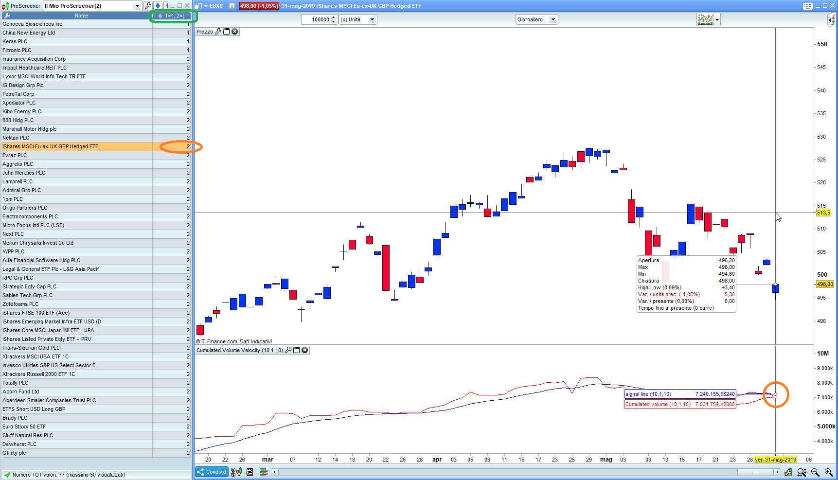 After studying and using Nicolas’Cumulated Volume Velocity indicator (https://www.prorealcode.com/prorealtime-indicators/cumulated-volume-velocity/), I wrote this simple screener to detect bullish and bearish crossings: