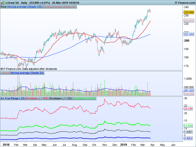 Now let’s say you want to use 7 times the value of the ATR trailing stoploss for example you would risk 500 euro’s and like this example Loreal SA stock the ATR 20 period = € 3.30 * 7 = € 23.1 so the stoploss should be 23.1 euro below the entry price and this would trail behind every new high. So if we risk € 500 euro’s devided by 23.1 (500 / 23.1 = ) € 21,64 so we can buy 23 stocks of Loreal.