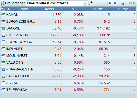 This *market-wide screener* works along similar lines as this *fund-specific indicator* in the PRC library list: “Candlestick patterns recognition”