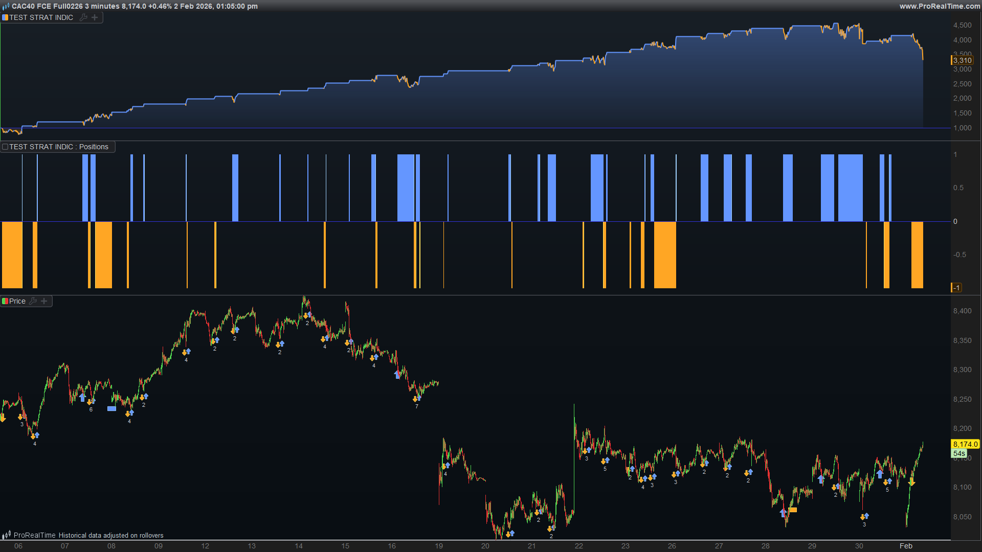 This ProOrder code (strategy) implements a trend tracking system based on a crossing of the price with Bollinger-type bands and a dynamic trailing stop. It is designed to work on the CAC 40 (Spread) in a 3-minute timeframe, with hourly/daily filtering rules and risk management via stop loss and target.