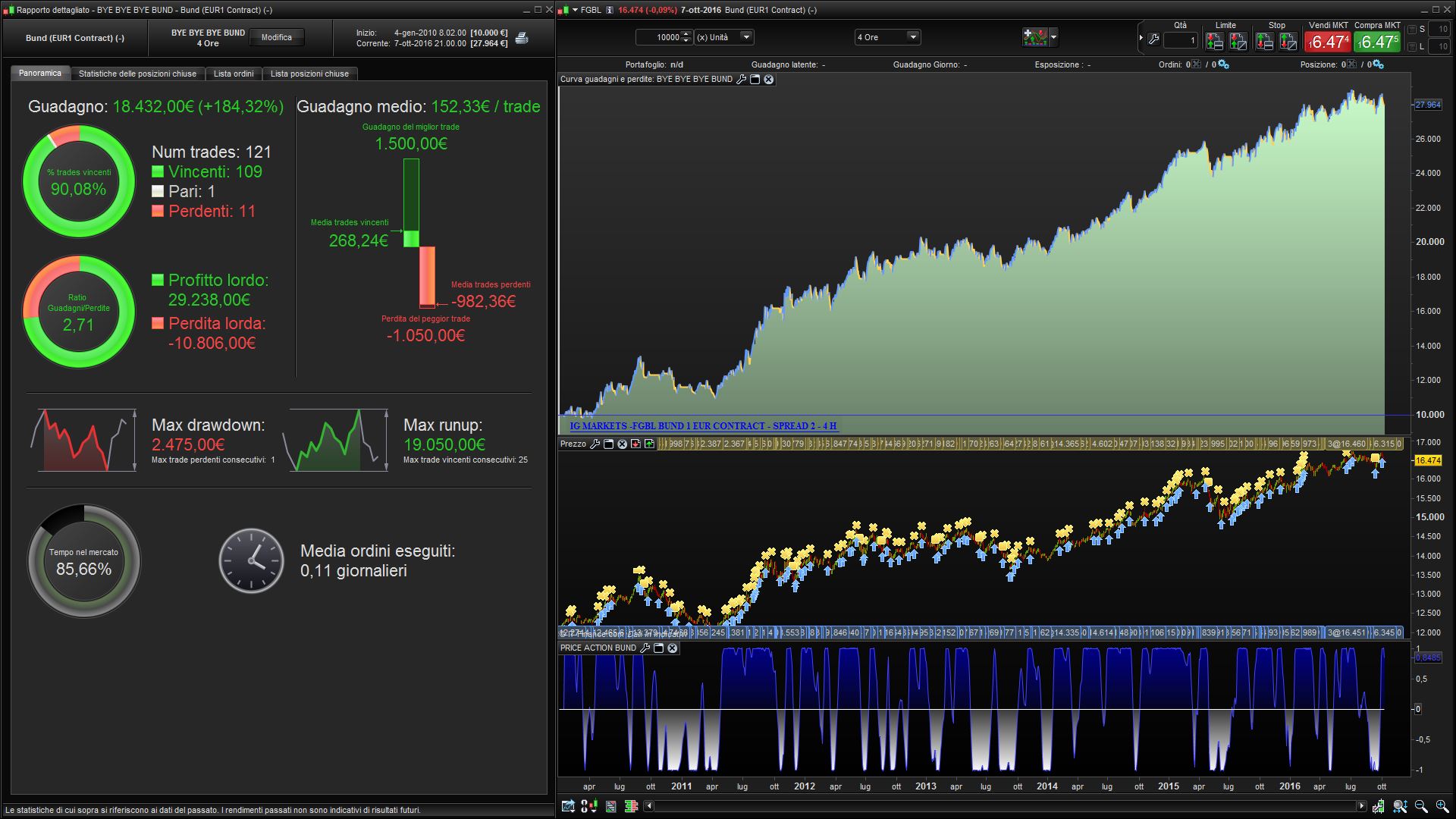 Long only strategy for the BUND (1 eur per contract) on a 4 hours timeframe. Backtest with 2 points spread from mid-2010 to now.