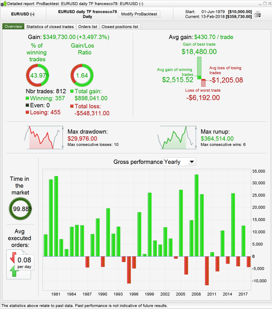 This EURUSD daily timeframe strategy is a simple code based mostly on the current trend detected by the difference of the Close with a simple moving average.