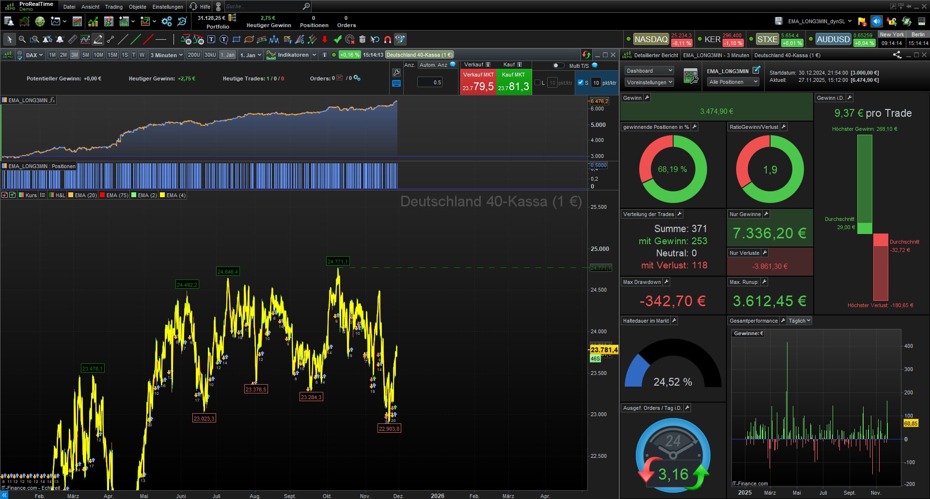 Dear community, Attached is my code for the DAX on a 3-minute basis, long only. It is kept very simple. The conditions are that the EMA 2 crosses above the EMA 4 while the EMA 20 is above the EMA 75. A very tight stop-loss of 0.15 is to be set once the profit reaches 0.25%. At 0.5% the position is closed. The backtest results show clear profits.