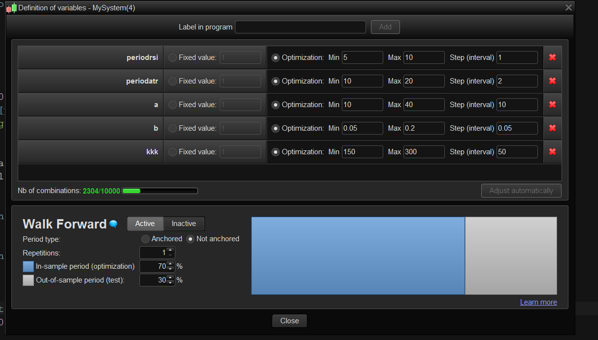 Results attached are from walk forward analysis with 1 OOS period proving robustness of the optimized variables. Variables to be optimized are also described in one of the attached picture.