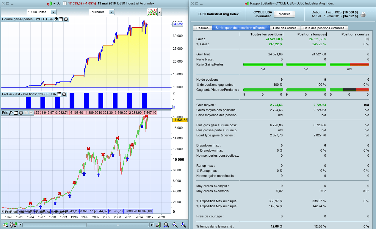 // CYCLE PRESIDENTIEL USA Defparam cumulateorders = false //TAILLE DES POSITIONS N = 2 // à adapter selon DJ, S&P500, etc. // CYCLE PRESIDENTIEL DE 4 ANS ANNEEDEBUT = 1982 IF year >= (ANNEEDEBUT + CYCL) and month >= 09 and day >= 25 THEN buy n shares at market ENDIF IF year >= (ANNEEDEBUT + CYCL + 1) and month >= 12 and day >= 25 THEN sell at market CYCL = CYCL + 4 ENDIF |