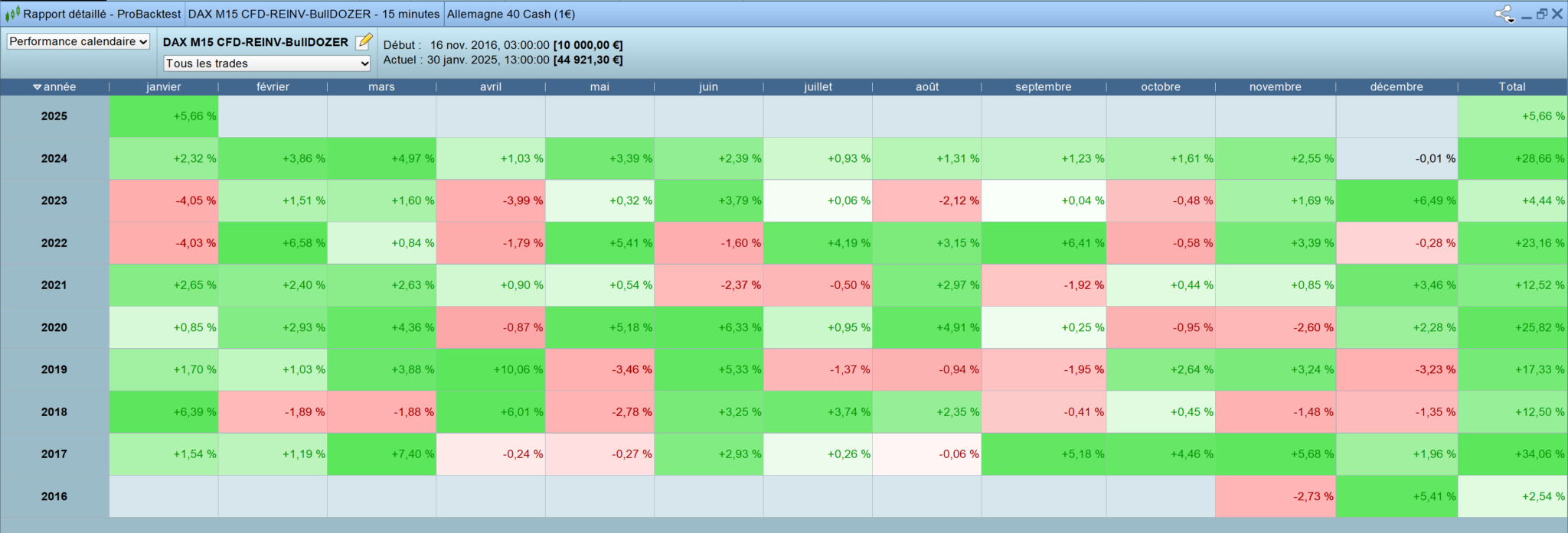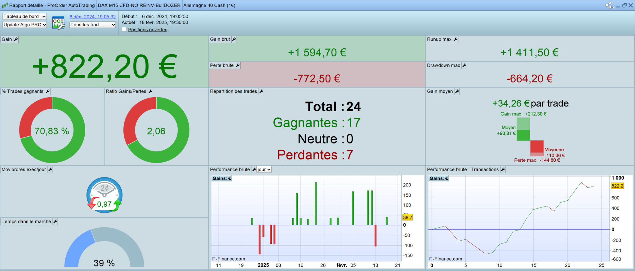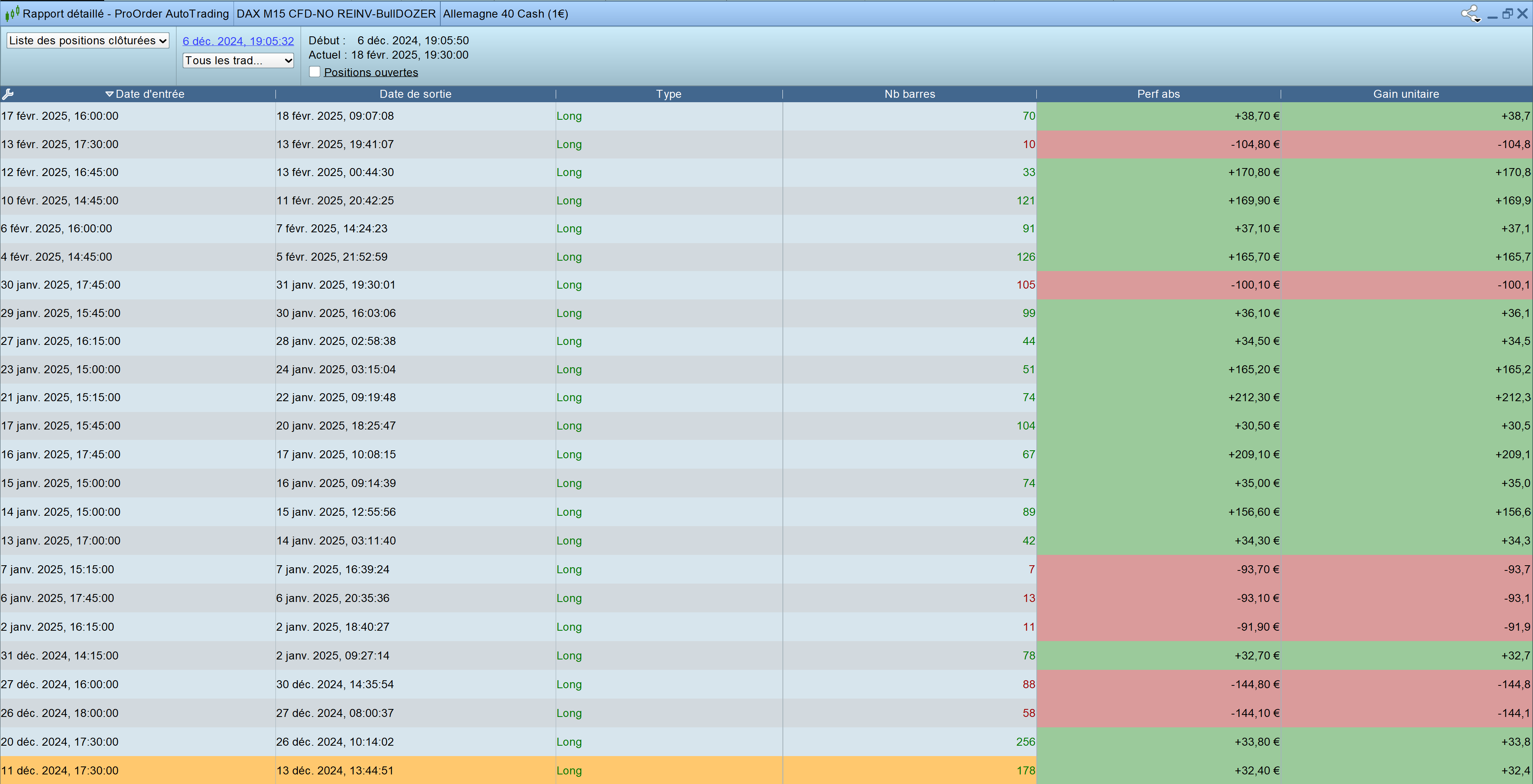 Entry Exit Type Nb bars Perf abs 17 févr. 2025, 16:00:00 18 févr. 2025, 09:07:08 Long 70 +38,76 € 13 févr. 2025, 17:30:00 13 févr. 2025, 19:41:07 Long 10 -104,80 € 12 févr. 2025, 16:45:00 13 févr. 2025, 20:44:30 Long 33 +170,80 € 10 févr. 2025, 14:45:00 11 févr. 2025, 20:42:25 Long 121 +169,90 € 6 févr. 2025, 16:00:00 7 févr. 2025, 14:24:23 Long 91 +37,10 € 4 févr. 2025, 14:45:00 5 févr. 2025, 21:52:59 Long 126 +165,70 € 30 janv. 2025, 17:45:00 31 janv. 2025, 19:30:01 Long 105 -100,10 € 29 janv. 2025, 15:45:00 30 janv. 2025, 16:03:06 Long 99 +36,10 € 27 janv. 2025, 16:15:00 28 janv. 2025, 02:58:38 Long 44 +34,50 € 23 janv. 2025, 15:00:00 24 janv. 2025, 03:15:04 Long 51 +165,20 € 21 janv. 2025, 15:15:00 22 janv. 2025, 09:19:48 Long 74 +212,30 € 17 janv. 2025, 15:45:00 20 janv. 2025, 18:25:47 Long 104 +30,50 € 16 janv. 2025, 17:45:00 17 janv. 2025, 10:08:15 Long 67 +209,10 € 15 janv. 2025, 15:00:00 16 janv. 2025, 09:14:39 Long 74 +35,00 € 14 janv. 2025, 15:00:00 15 janv. 2025, 12:55:56 Long 89 +156,60 € 13 janv. 2025, 17:00:00 14 janv. 2025, 03:11:40 Long 42 +34,30 € 7 janv. 2025, 15:15:00 7 janv. 2025, 16:39:24 Long 7 -93,70 € 6 janv. 2025, 17:45:00 6 janv. 2025, 05:35:36 Long 13 -93,10 € 2 janv. 2025, 16:15:00 2 janv. 2025, 18:40:27 Long 11 -91,90 € 31 déc. 2024, 14:15:00 2 janv. 2025, 09:27:14 Long 78 +32,70 € 27 déc. 2024, 16:00:00 30 déc. 2024, 14:35:54 Long 88 -144,80 € 26 déc. 2024, 18:00:00 27 déc. 2024, 08:00:37 Long 58 -144,10 € 20 déc. 2024, 17:30:00 26 déc. 2024, 10:14:02 Long 256 +33,80 € 11 déc. 2024, 17:30:00 13 déc. 2024, 13:44:51 Long 178 +32,40 € -