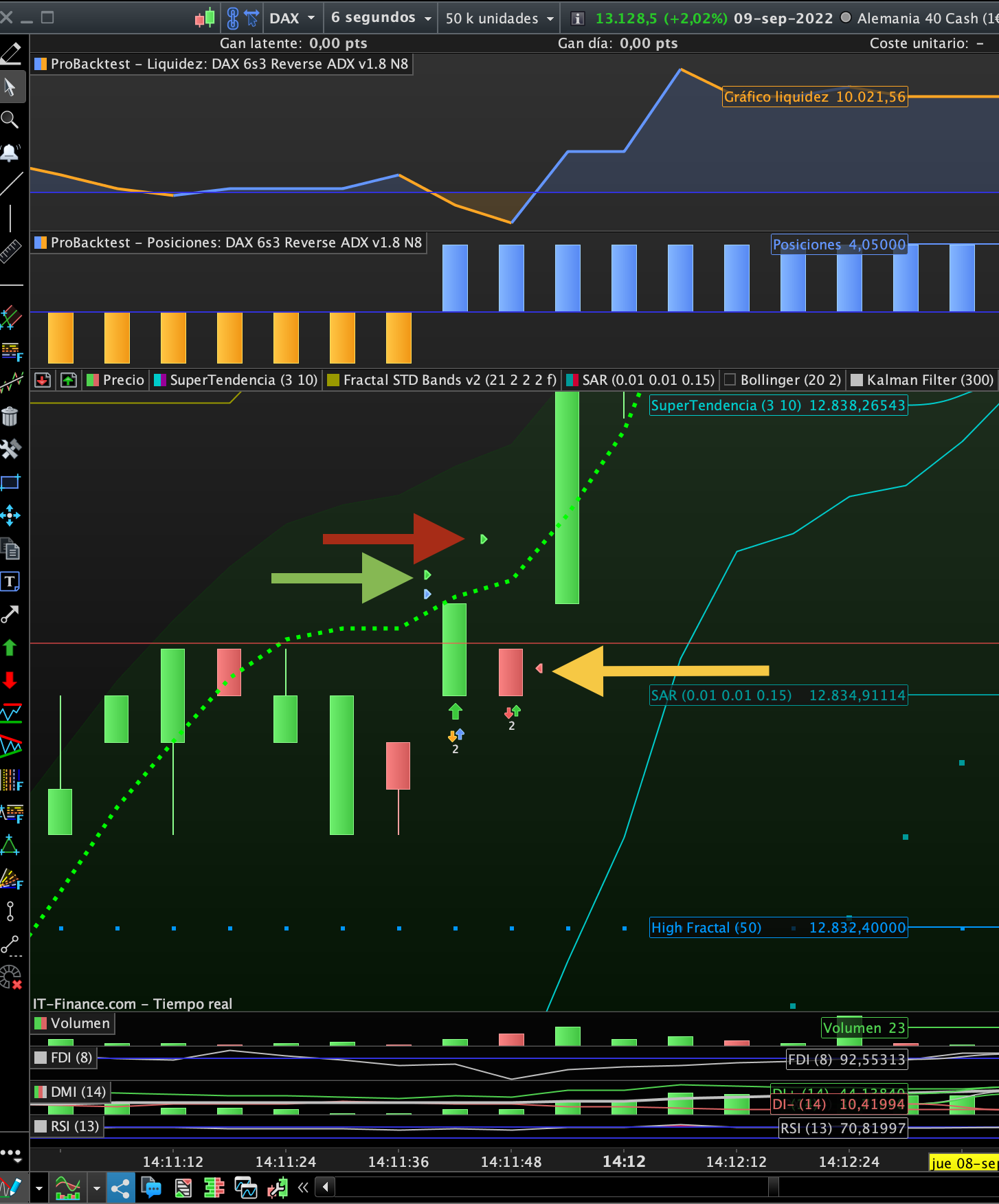 The long positions (4.05 contracts ) starts on the correct candle ( GREEN ARROW). The short position is closed on the candle atfer ( RED) (3 contracts)and then another 3 contract are sold short without any reason ( Orange Arrow) ( 3 contracts)