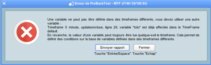 Tu as du changé ton code depuis l’image du message d’erreur. En effet, on ne peut renseigner une variable avec des valeurs différentes dans 2 timeframes différents, dans le message il parle de la variable “toto”, mais je pense qu’en fait c’est plutôt ta variable “cestlapero” qui est en faute ! Celle-ci est déclaré (on lui affecte une valeur) à la fois dans le timeframe default et dans le timeframe 4 heures.