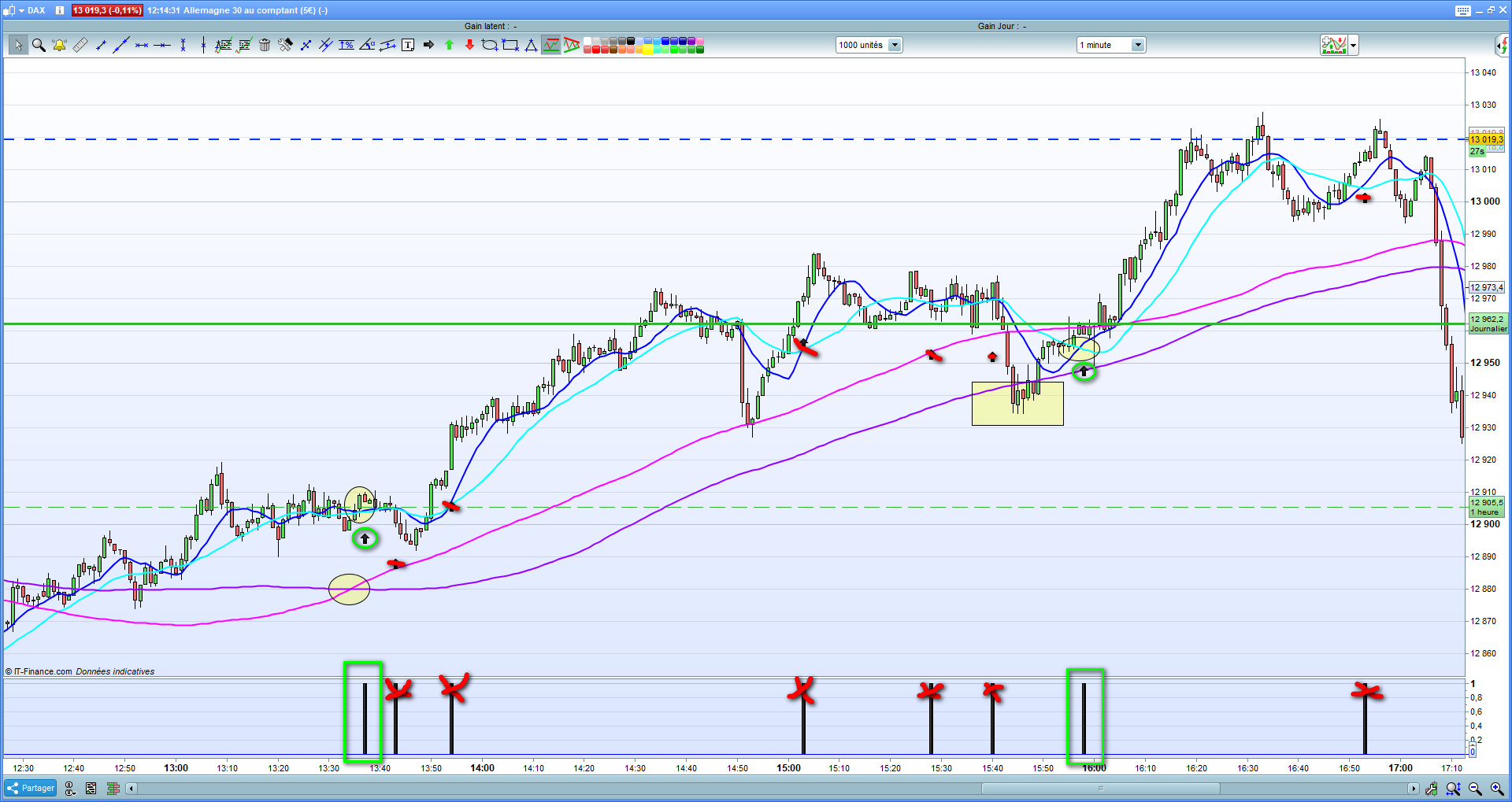 Par exemple, quand la MM10 croise à la hausse la MM20 alors que la MM100 est au-dessus de la 150 alors je déclenche un ordre à l’achat.