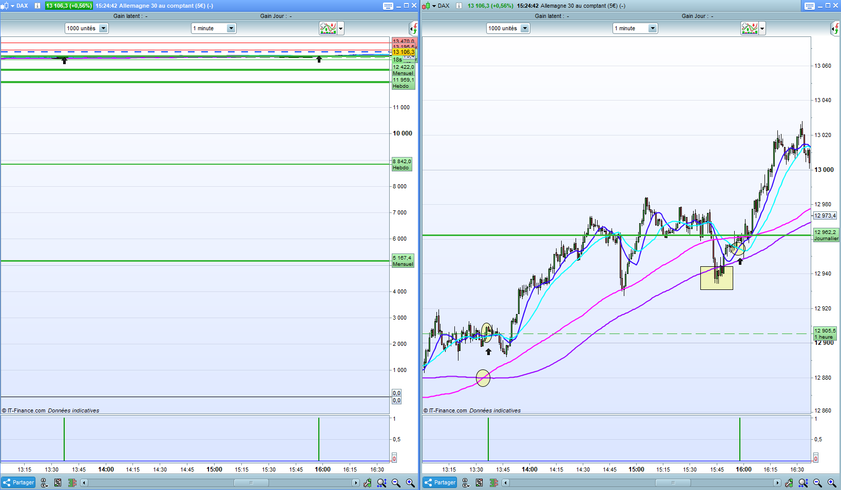 J’ai deux moyennes mobiles de période 10 et 20 et deux moyennes mobiles de période 100 et 150.