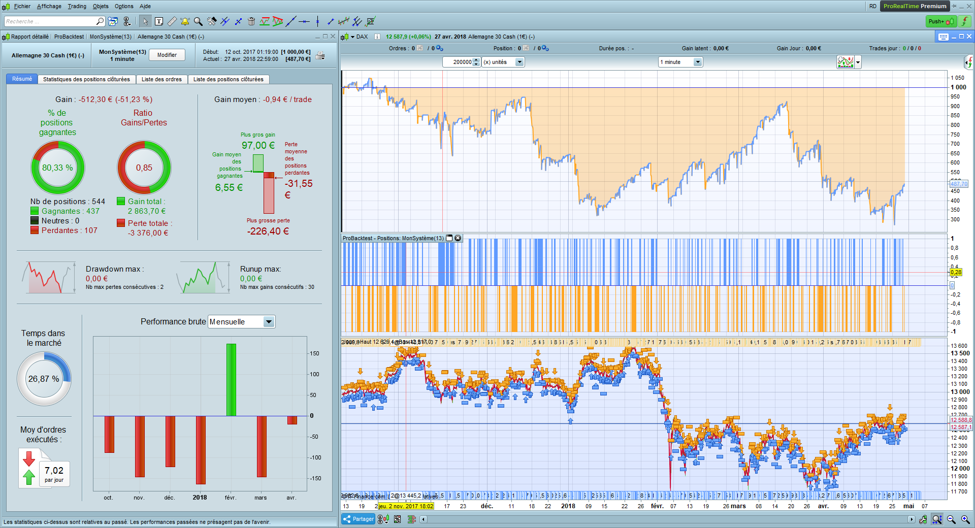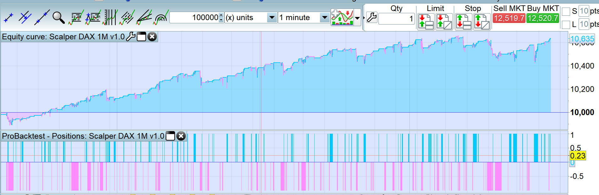 DAX, 1 min TF, spread = 2 and 100k bars. I’m setting it going on Demo.