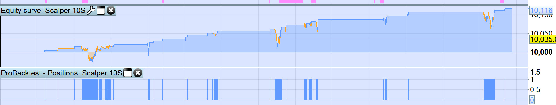 The idea is to acquire mall profit (£5) at a time but lots of them throughout a day since the strategy runs on 10sec time frame.