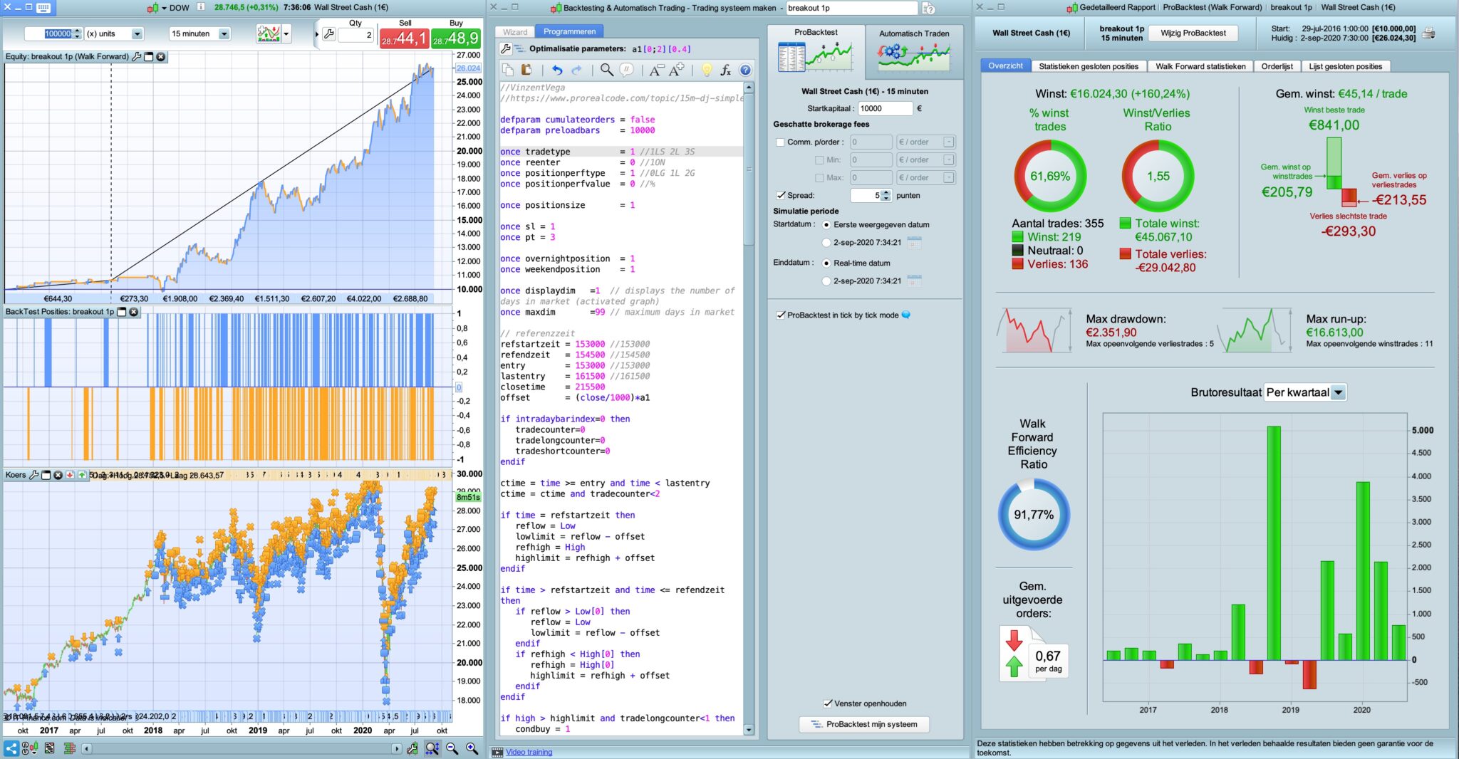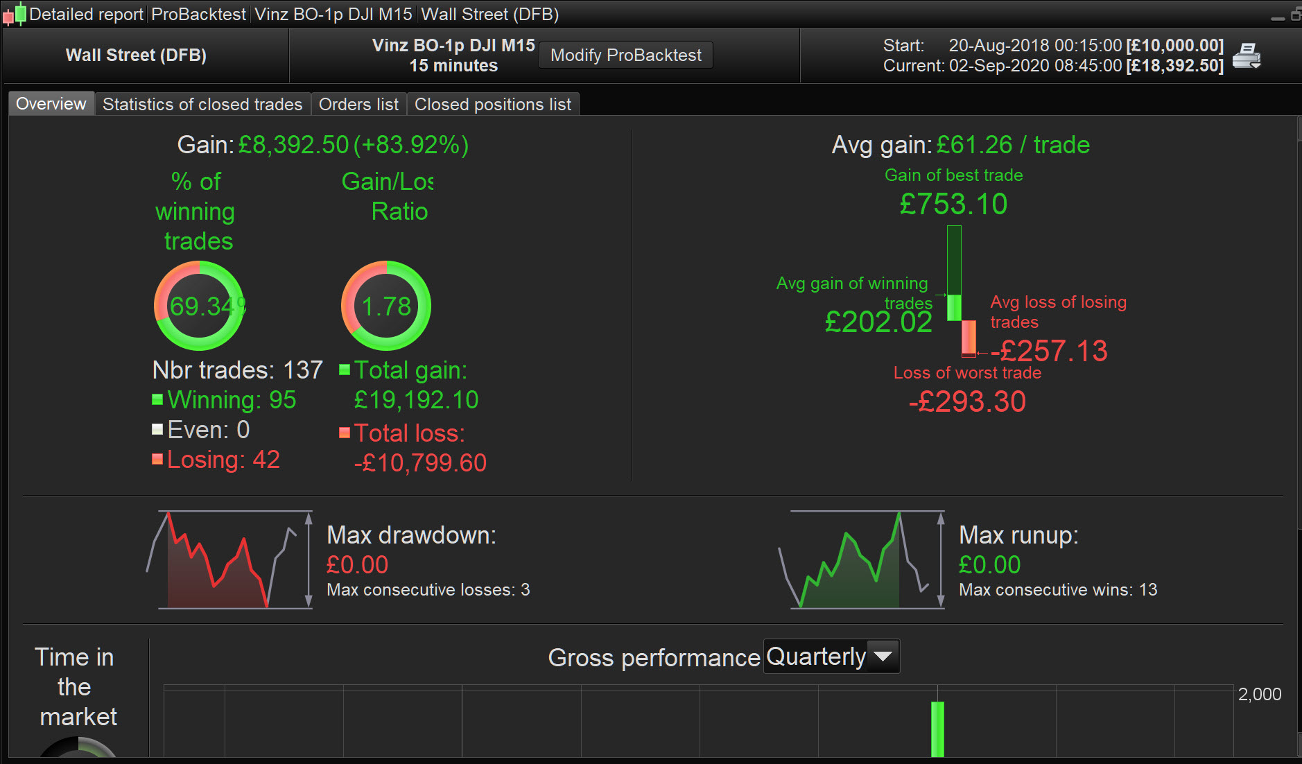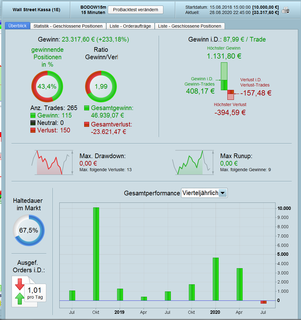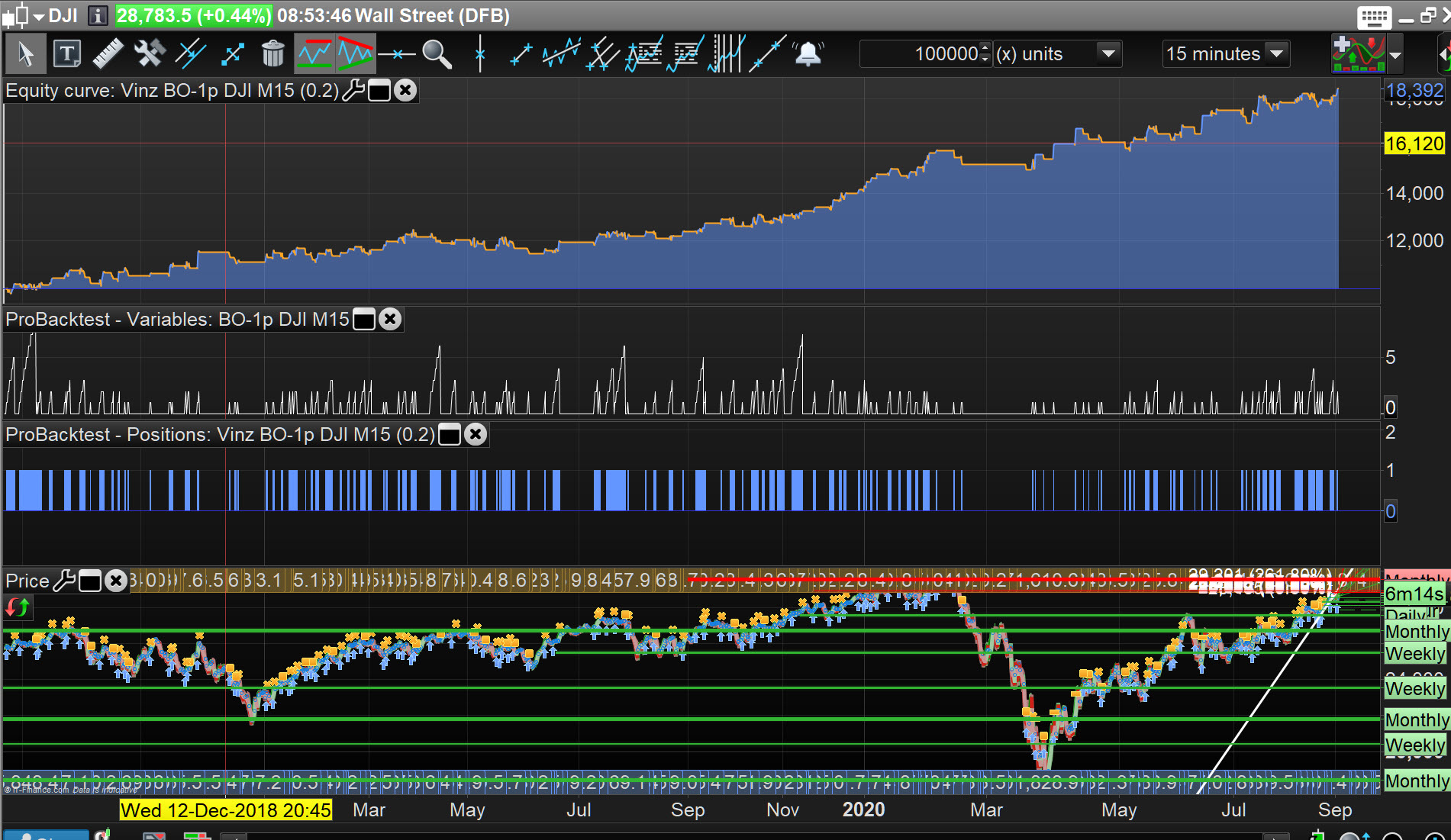 attached a simple DOW breakout strategy. It works fine in the last 2 years. But i think it would be more profitable to add one or 2 variables into ist. But i don´t want to over-fitting this strategy, i want to keep it simple. Only the lots of loosers in a row are negetive. It needs a 2nd variable. New ideas are welcome. 🙂