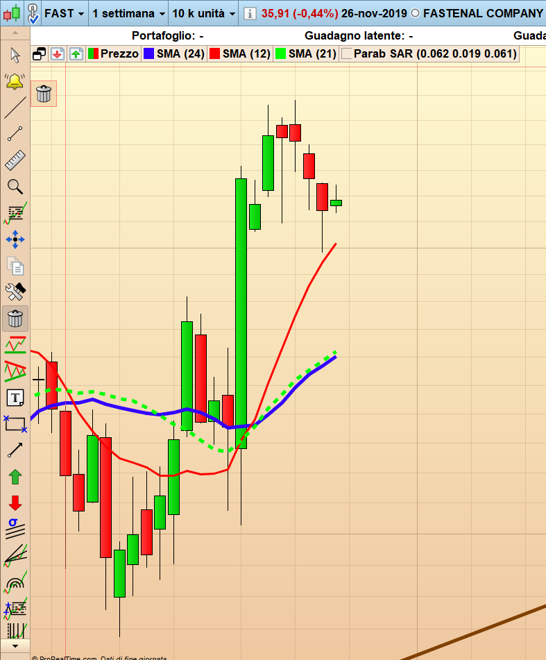 Altro titolo che non capisco perché sia stato trovato dalla nuova regola: FASTENAL COMPANY (vd.allegato). Effettivamente ci sono 2 candele consecutive “rosse”….ma, come avevo scritto nel secondo messaggio, per me entrambe sono da considerarsi “rialziste” in quanto, anche se rosse, il “braccio lungo” è sotto il corpo in ambo i casi…e, essendo appunto rialziste nonché al di sopra delle MM..tale titolo NON dovrebbe essere trovato.