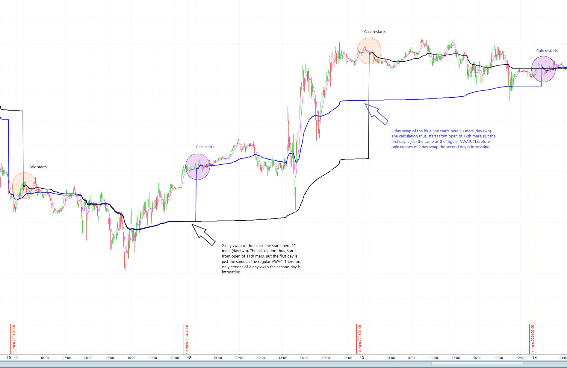 On a historical chart, you would then see the VWAP starting from each day’s opening but not closing until the next day’s close. In other words, it overlaps each other all the time. Then you can perhaps also color day 1 in one color and day 2 in another to easily separate them visually.