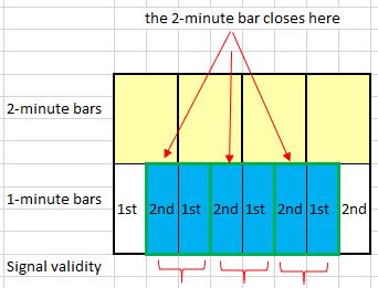 - On the first 1-minute bar the 2-minute the signal is not shown (the one of the previous 2-minute bar is, if any).