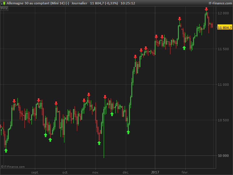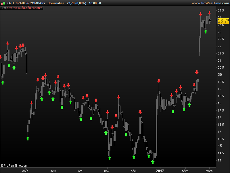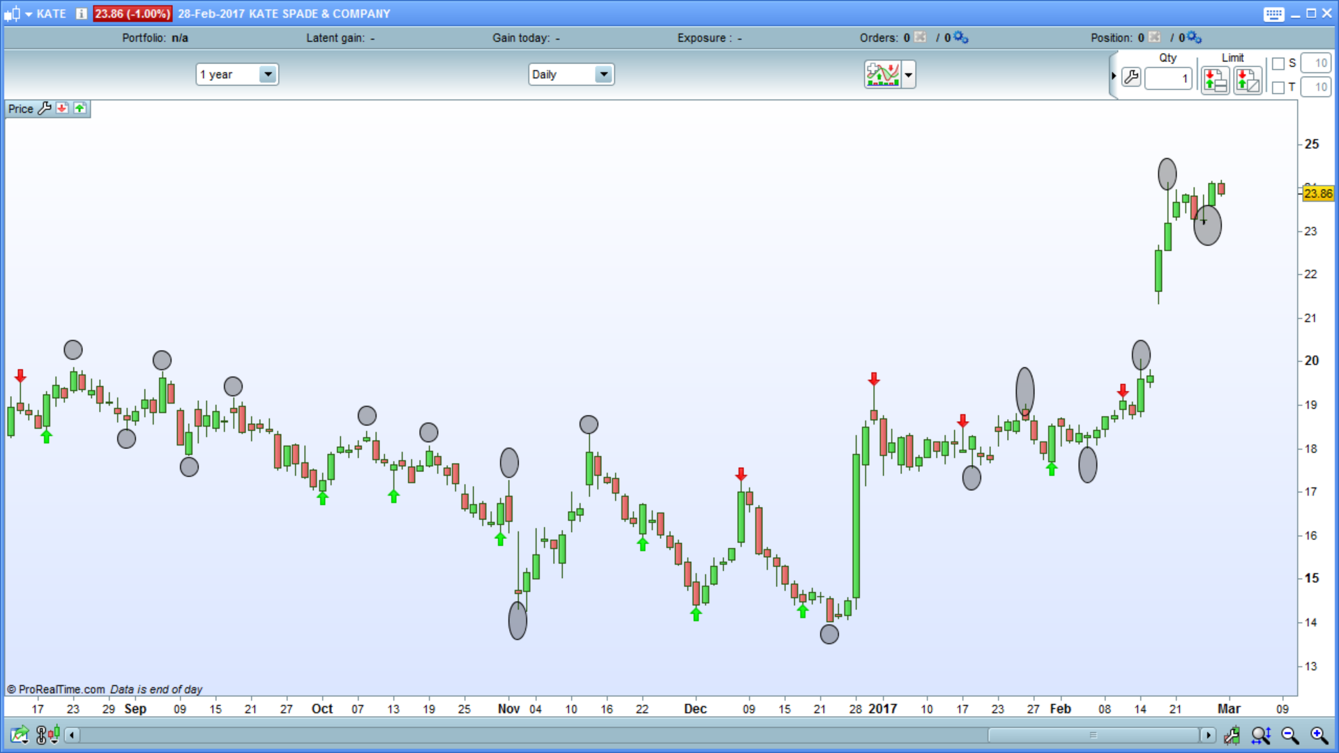 Sorry for this confusion. I took a snapshot of the ProRealTime screen with KATE ticker and it shows your indicator with green and red arrows and then I put on grey ellipses next to the candlesticks that the indicator didn’t put the arrows on. Please if you can, look at it, I am attaching the screenshot down below.