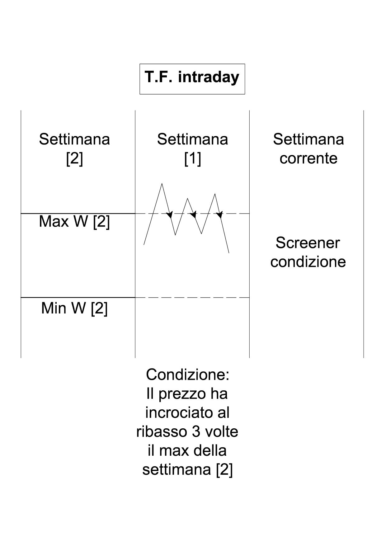 Nella settimana [1], il prezzo deve superare al rialzo e poi tornare sotto il Max W[2] per almeno 3 volte (quindi 3 incroci ribassisti);