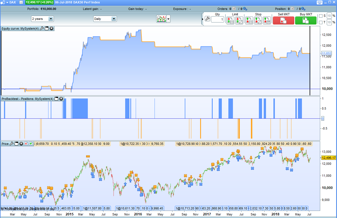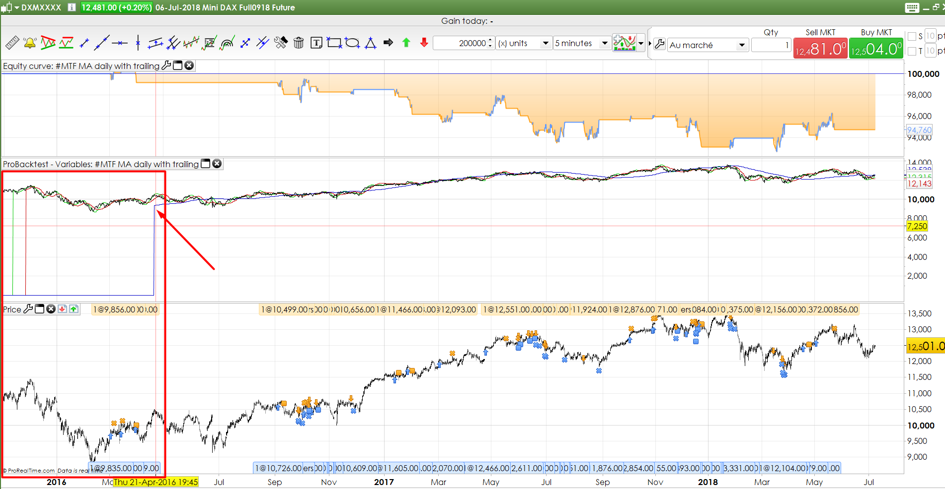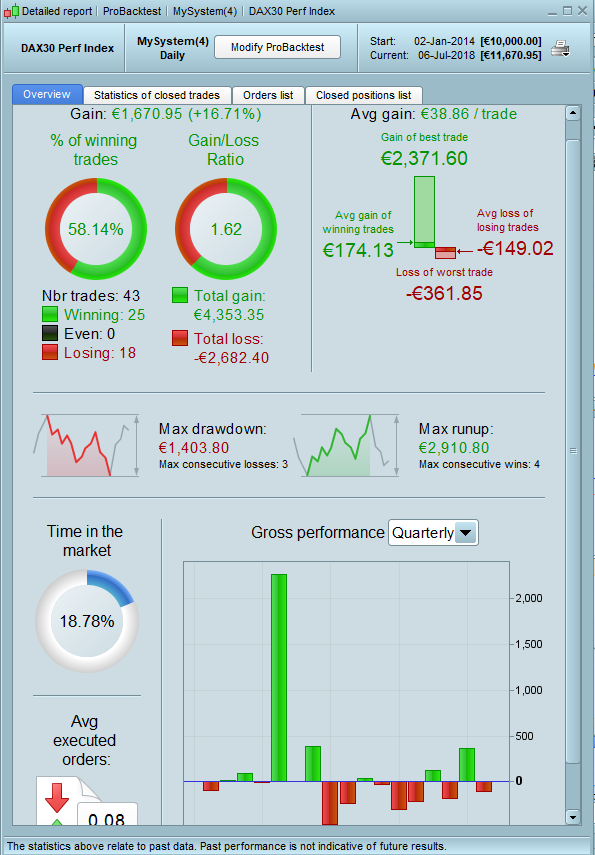The performance is not good (made with tick mode and spread=1.5), and as you can see in the attached picture, daily MA are not calculated until there is enough bars in the default timeframe (5-minute TF). This is something we should be aware of when backtesting… a test to verify if the SMA are superior to 0 could be enough..