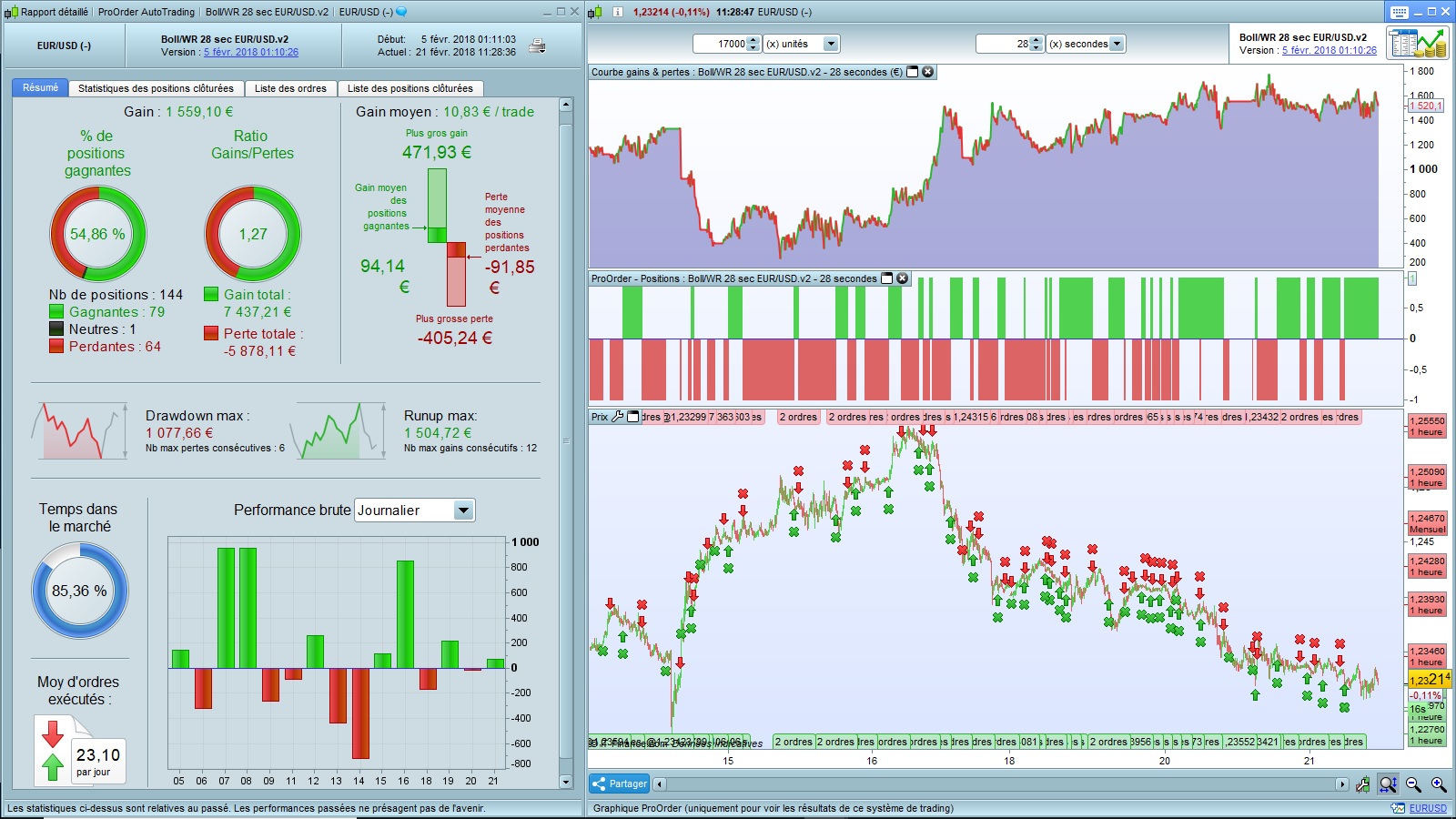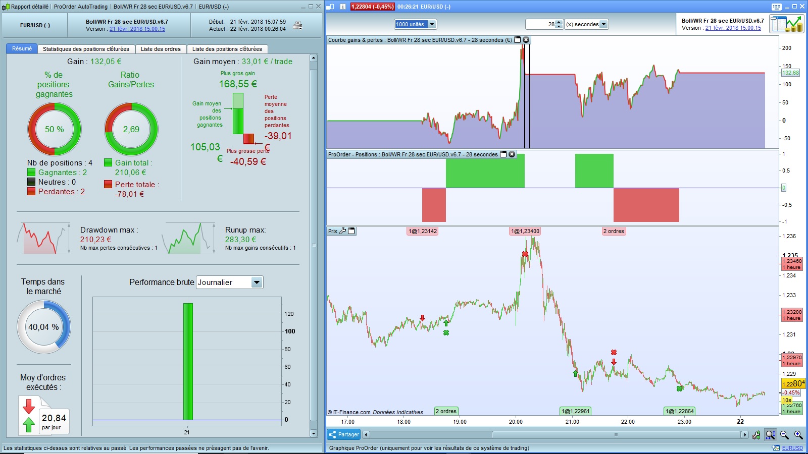 I thank you for your interest in this line of the forum. I just read you and allow me to answer you. It is true that on the number of edited versions, there is little that passes ProOrder selection. This shows us that Backtests are insufficient to validate a strategy, even with a lot of history. The 5mn versions have not been profitable and they are no longer listed. There are still some 28s versions that are still profitable, the oldest is the V2 that runs on ProOrder since 05/02 (Graph and results below). If you want to test, I invite you to look at the latest versions (versions 6 and 6. +), they are less subject to drawdowns unlike the V2 and others.