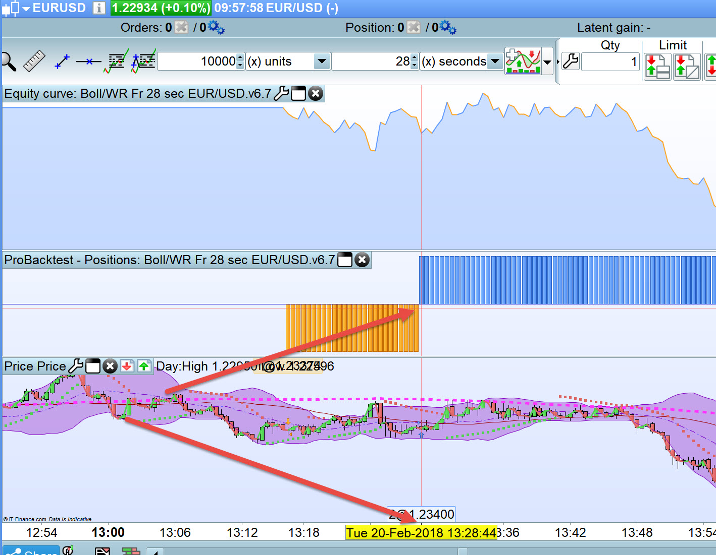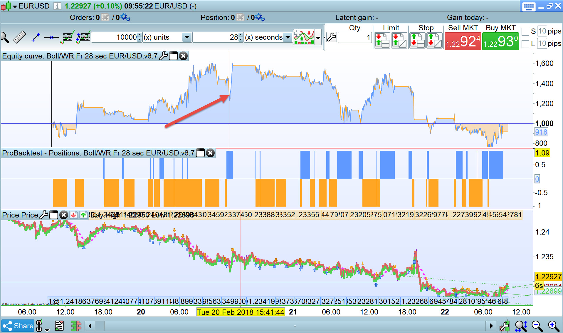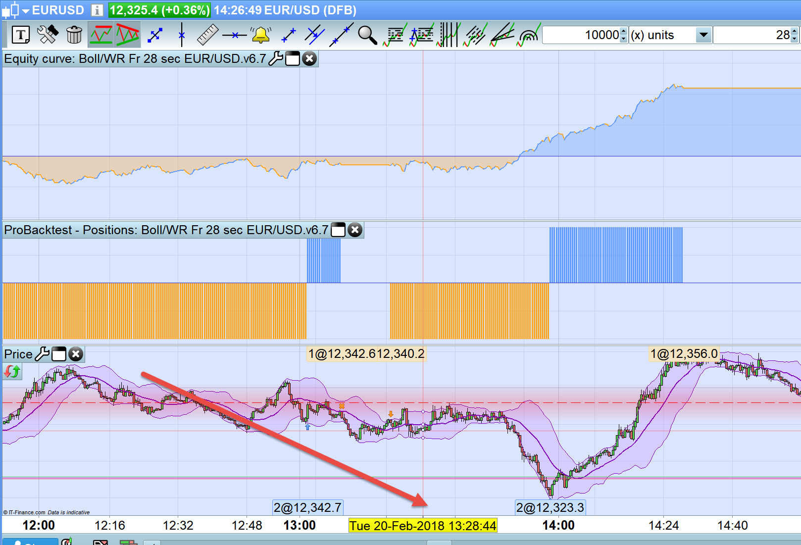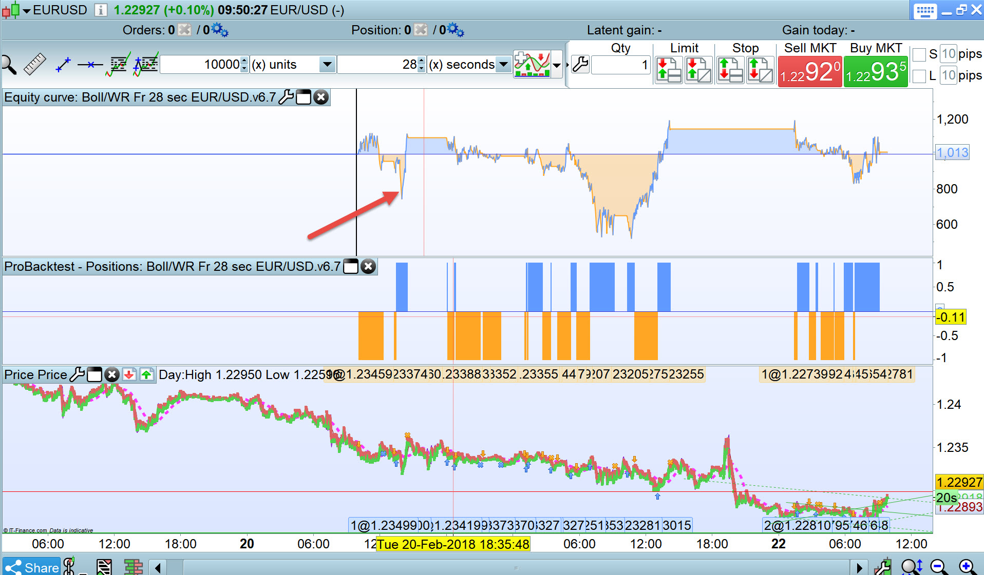 As you can see I have zoomed in on exactly the same time slot Tue 20 Feb at 13:28:44 and the accompanying trades are significantly different. I’ve done that fairly quick in between / while manual trading on the Dow so if I have made a mistake then please let me know.