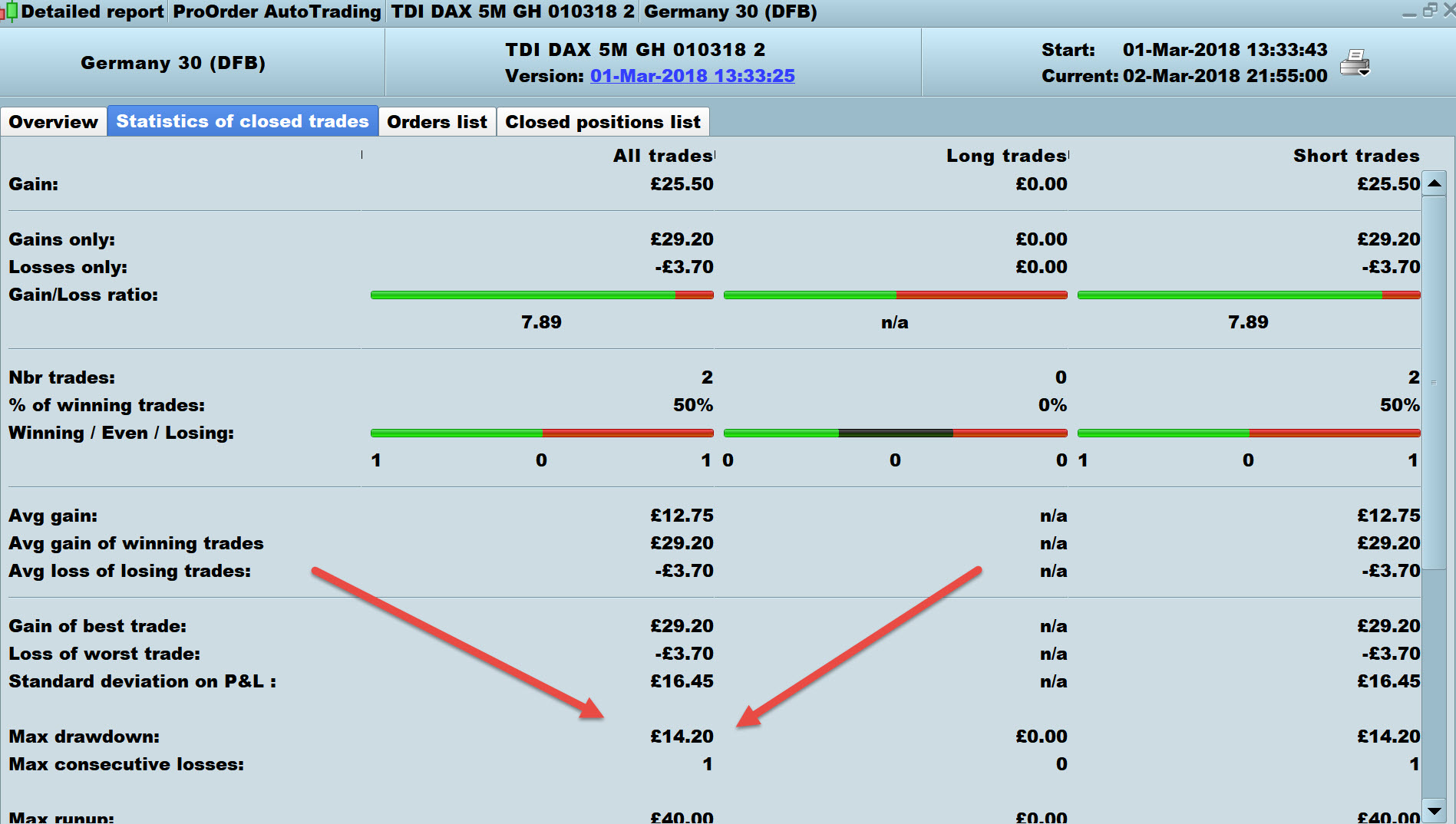 Gertrade the drawdown figure is on the Tab – Statistics of Closed Trades – see red arrows on attached