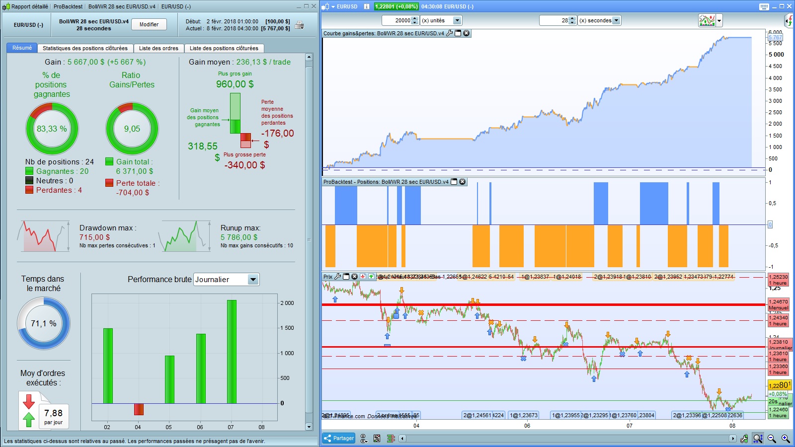So I had the idea to integrate the ADX in V2.2, which worked well, but had problems of Drawdown important. So I studied a new version, the V4, which integrates the ADX in V2.2. The results are excellent, the curve of equity better, the Gain too, the Drawdown too, the Ratio Gain / Loss too, with a much smaller number of trades.