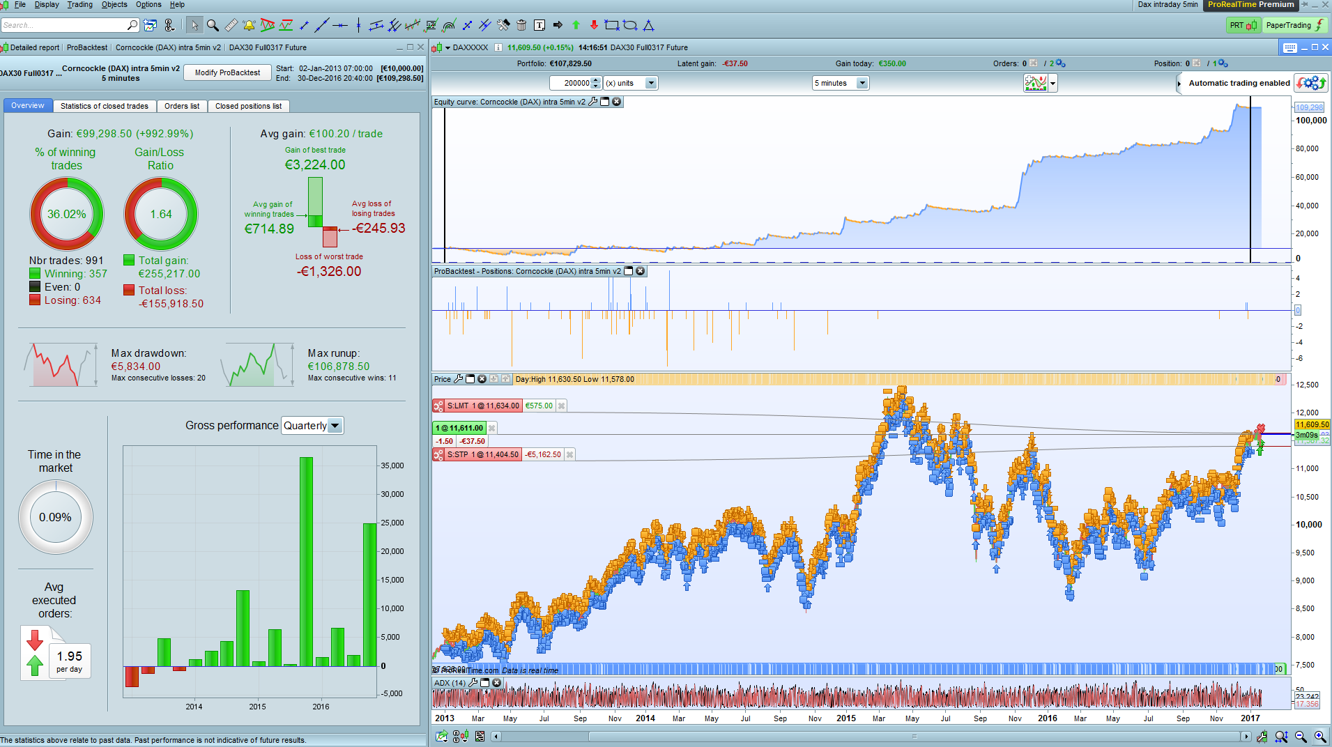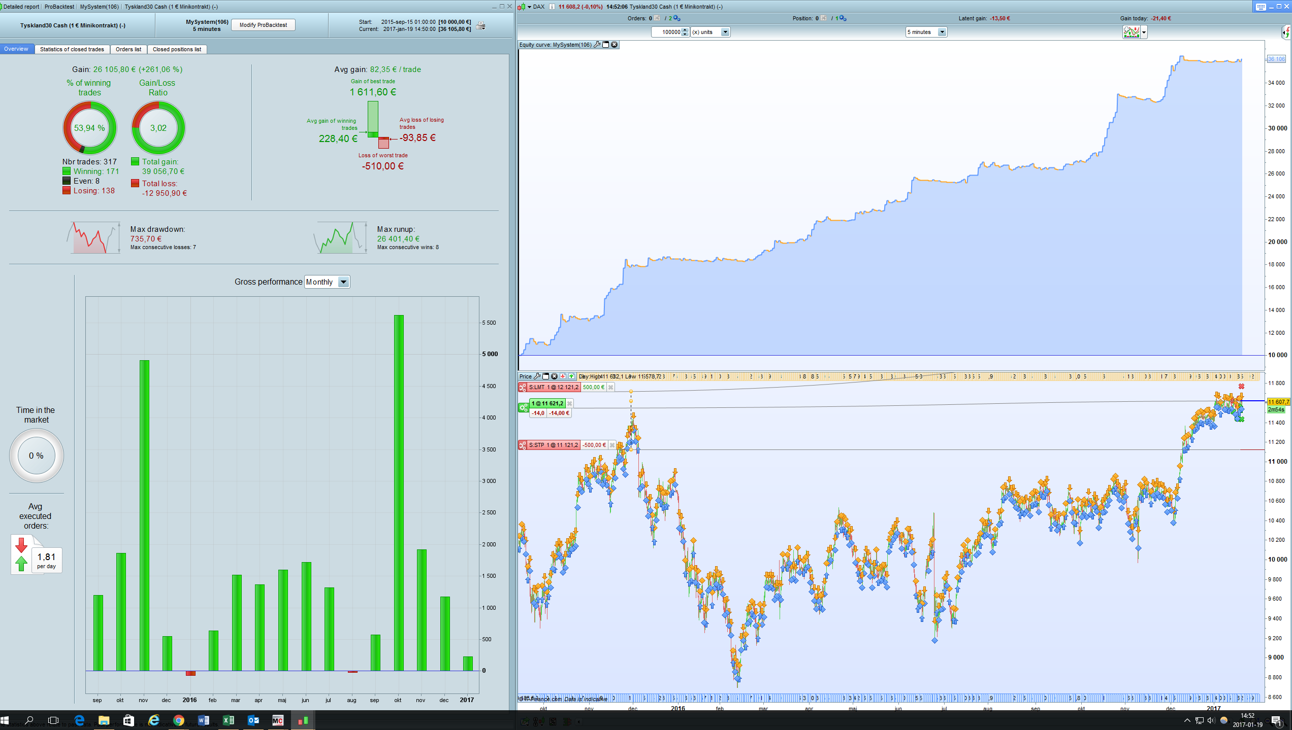 I (hopefully) attach the results from backtest with Stop 3, Target 12. You again need starting equity of EUR20k. Note the drawdown of EUR23k (I’m not sure I could live with that) and the large number of contracts you are sometimes trading (not sure how realistic). It performs really well 2014+
