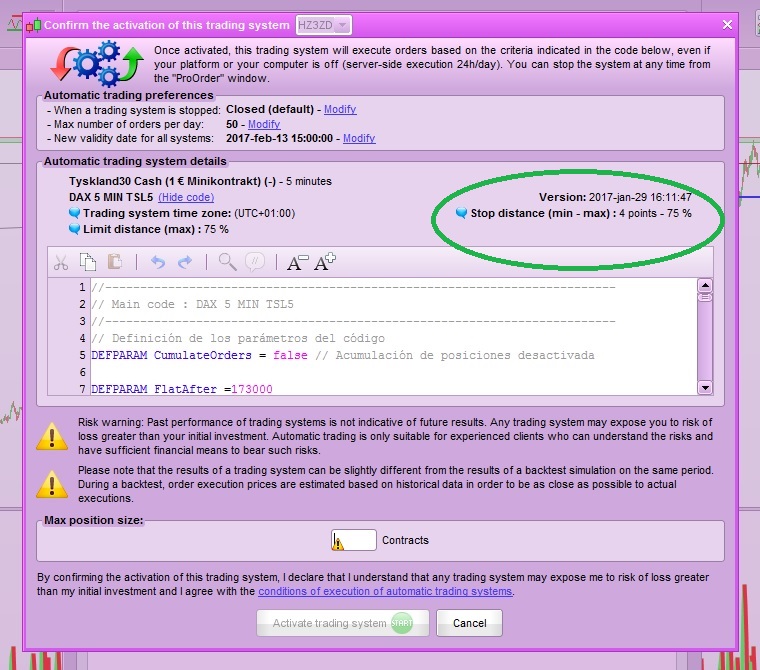 Also generally – if your code has a level of TS which is less than the minimum allowed (eg 3 instead of 5) then the system will automatically stop the ATS altogether and not enter the stop. You have to be careful though as the entry trade could still be executed (prior to the the TS, as they are done in order) leaving you with a live position without an attached stop (unless you have ticked the settings in PRT to close all positions when the TS is stopped), so you should always closely monitor your positions at the start of any new TS just to check.