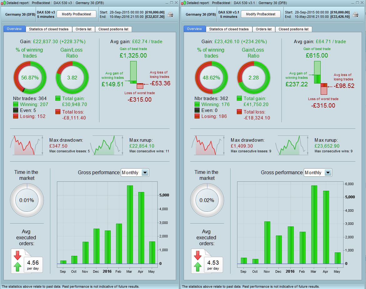 Raul – I agree with your findings. Attached is v2 backtest. Left is with a trailing stop of 5 and the right is sl 5 and tp of 10pts. The results overall are remarkably similar (even if there are a few individual variances) which I find difficult to believe, seems too coincidental. Therefore I don’t have much faith even in the stop loss/take profit method either at this time for reasons mentioned earlier due tick by tick testing problems. Something definitely is not right it seems.