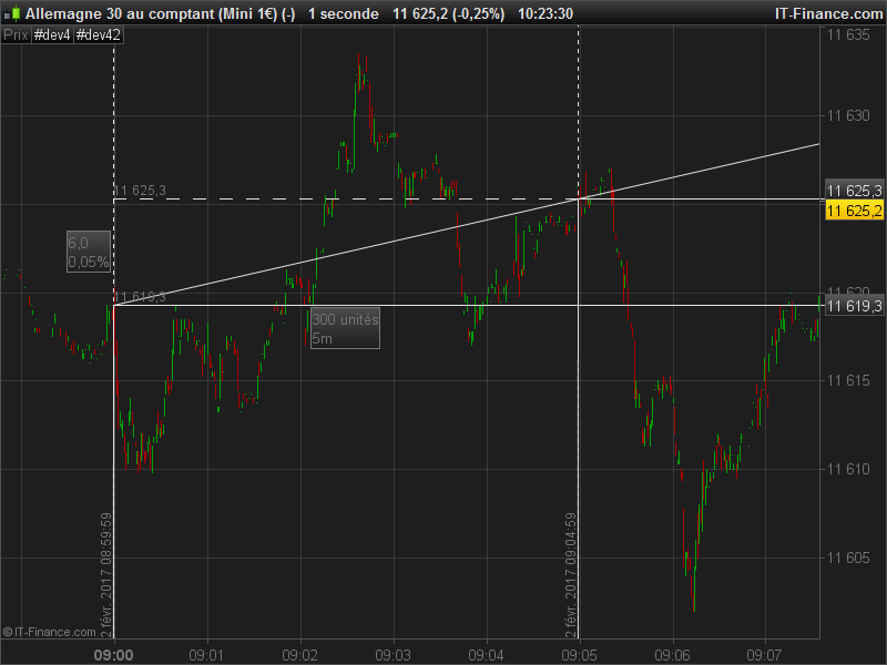 Hello! Yesterday I tried it in 1 minute with the trailing of PRT, today I will try in 1 second with the trailing of Nicolas. I suppose it will be necessary that the opening of the 9 is less closing at 9.05, ie, 5×60 = 300 seconds. Close [300] <open-2 for purchase and close [300]> open-1 for sale.