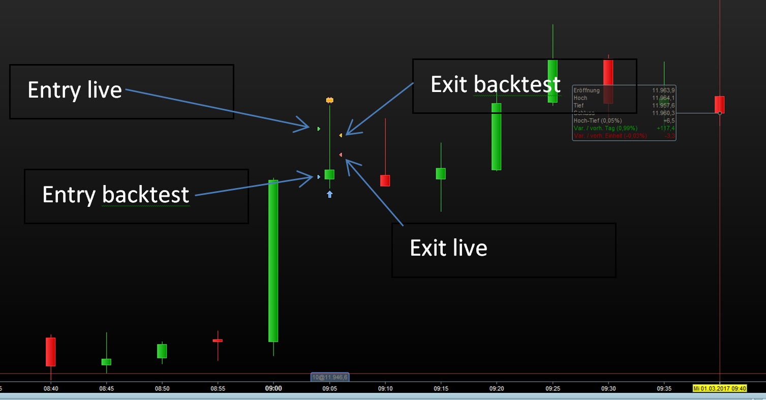 To no3 of your comment: In my experience the “set target” or “set stop…” command is very quick within the same candle. I am not quite sure about the “sell/ exitshort xy contract at …. stop/ limit” command – I think it opens only within the next candle. I think 1 candle has to elapse before PRT knows that you are onmarket. But the “set…” command ist immediately.