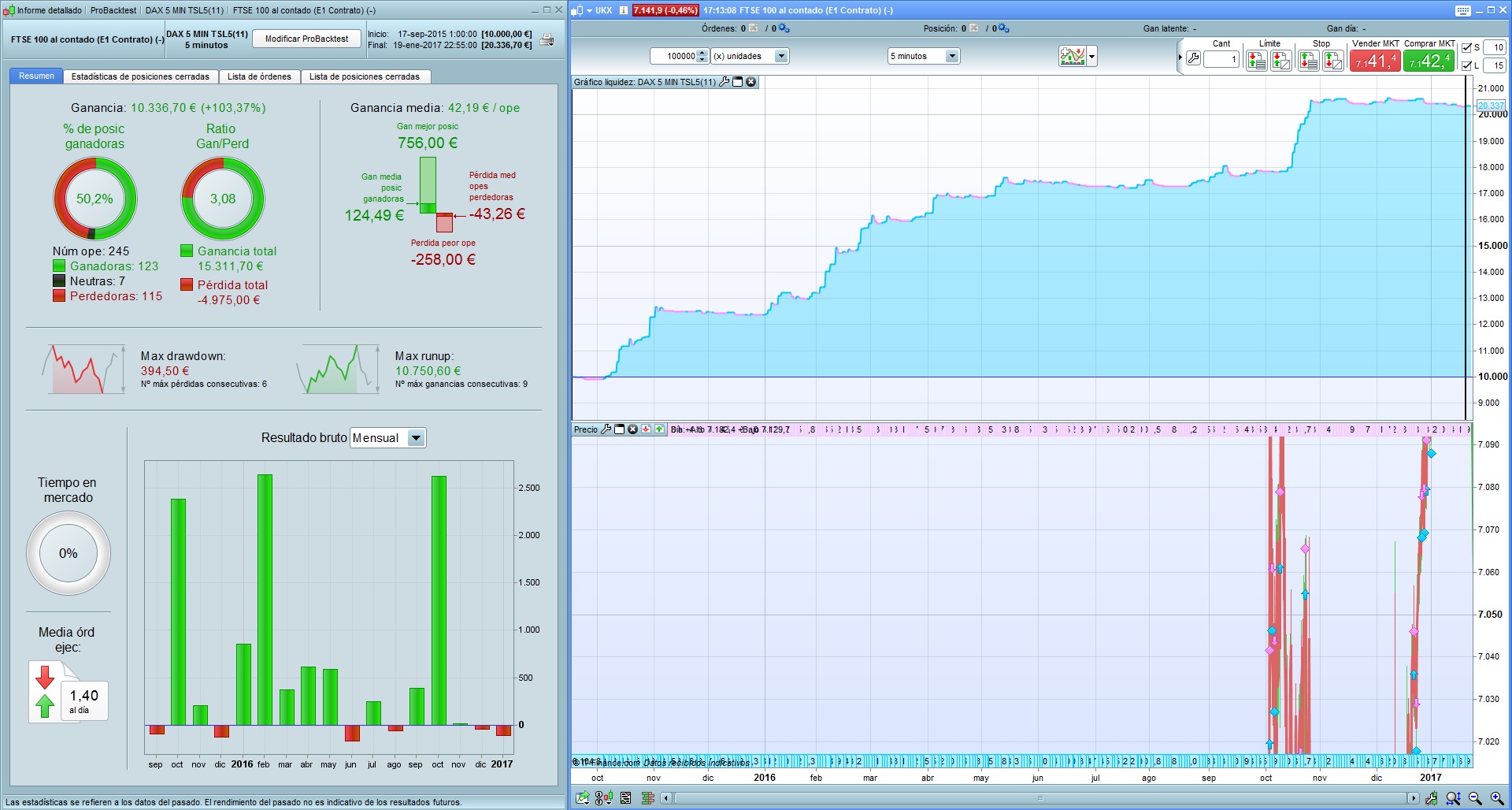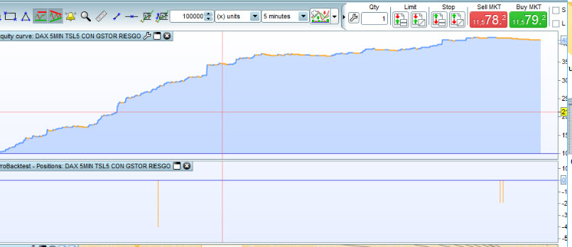 When I run Algo 5MIN TSL5 CON GSTOR RIESGO with tick-tick backtest ON I get zerobars, small profits, lots of small losses and £200 overall loss ((Capture 3 & 4 attached).