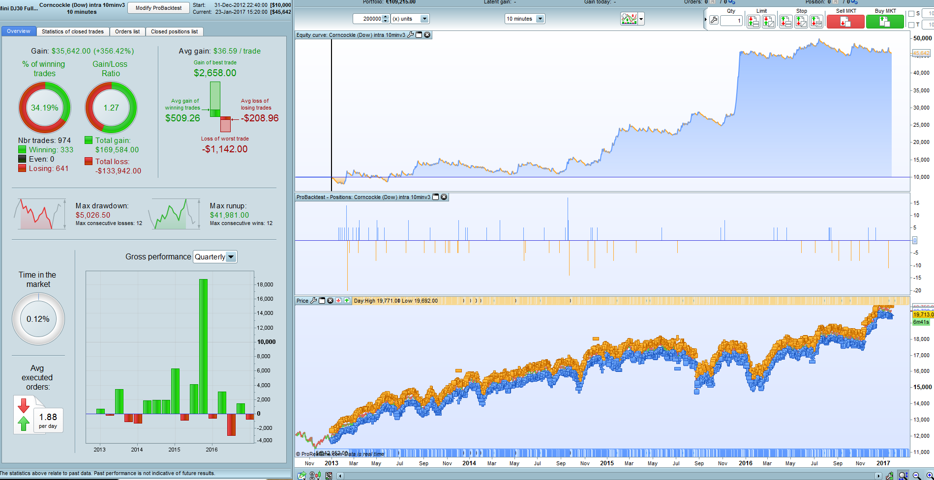 I’ve had to be a bit more aggressive with the lot sizing to get reasonable returns which I think is OK with the Dow rather than the Dax. In particular I start off with 5 lots. Also increase order size by 3. I haven’t used the cool risk management / sizing toolthat is a new bit of code I have seen (I’m not sure I would use this in practice anyway as I think I would prefer to manually control this (other than the increase +3 or reducing /2) considering market volatility, performance of different strategies…etc). I’m also not using the ptrailing as we know that it is not reliable in live trading on IG so I therefore don’t want to test this. I’m keeping it simple still with fixed stop and target. I’m sure there are better results to be had out there.