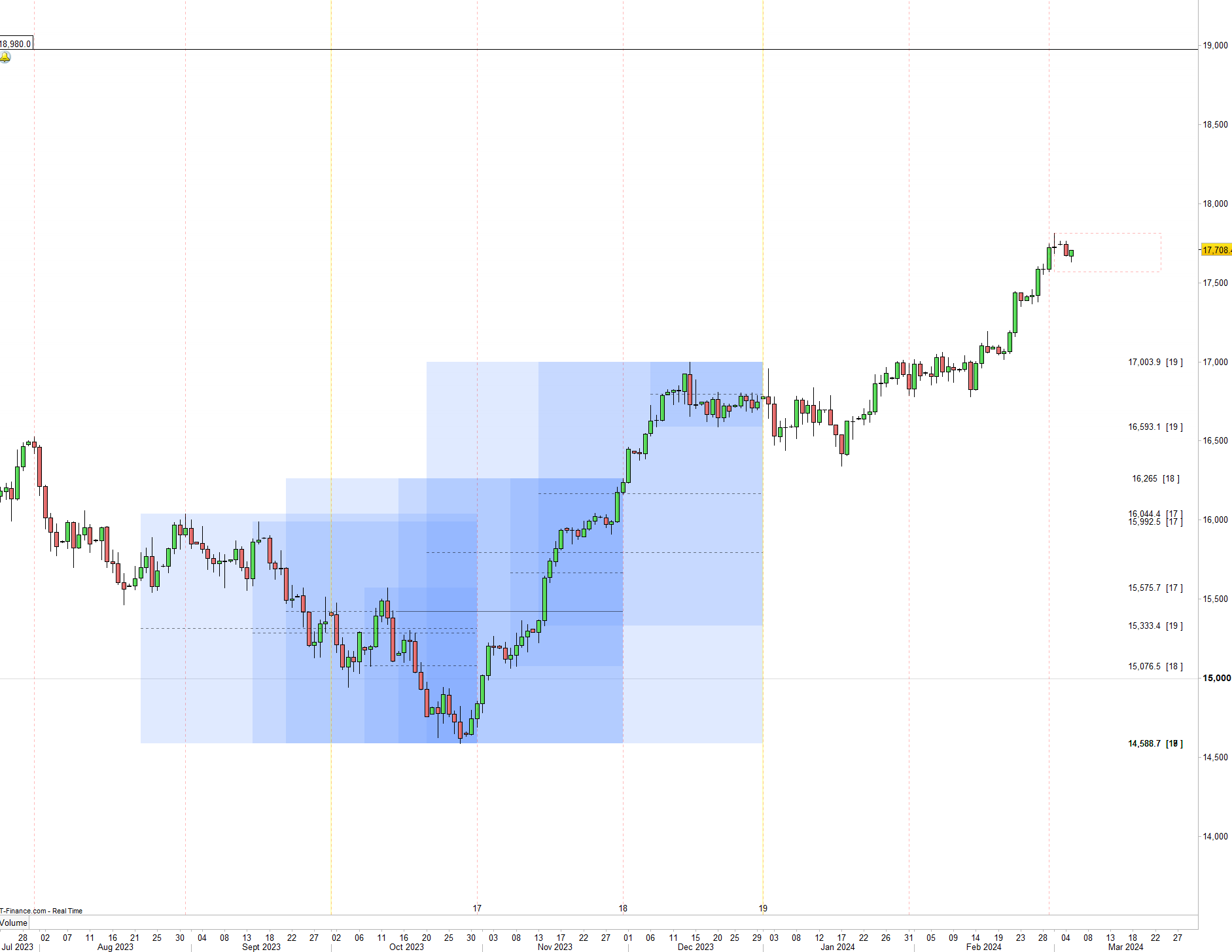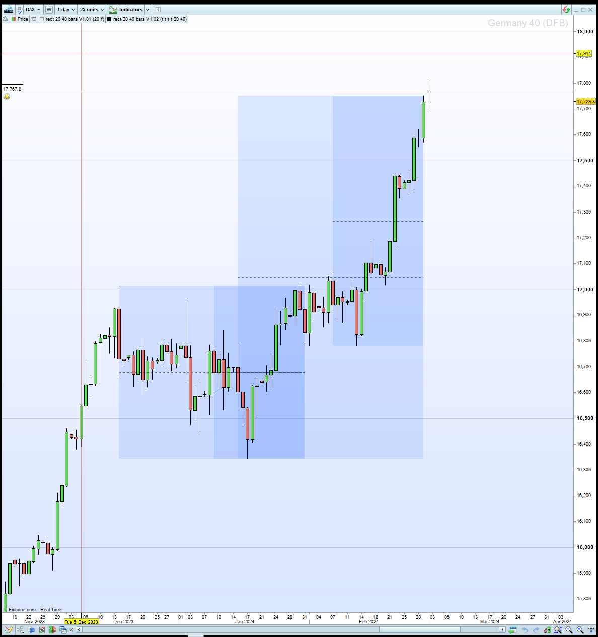 Hi all! I’d like to humbly ask a request from someone to code a dynamic rectangle with a centre line for me that marks the high and low of the past 20 & 40 days from the 1st of the current and previous month. I’d like there to be no borders but just a coloured but transparent rectangle of a 20 and 40 daily high and low? I searched the forum and found this as the closest example.