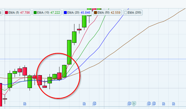 In the attached screenshot one can see the EMA5 crosses over the EMA10, EMA20 and the EMA50 within the last 5 days. So I wrote the code as follow: