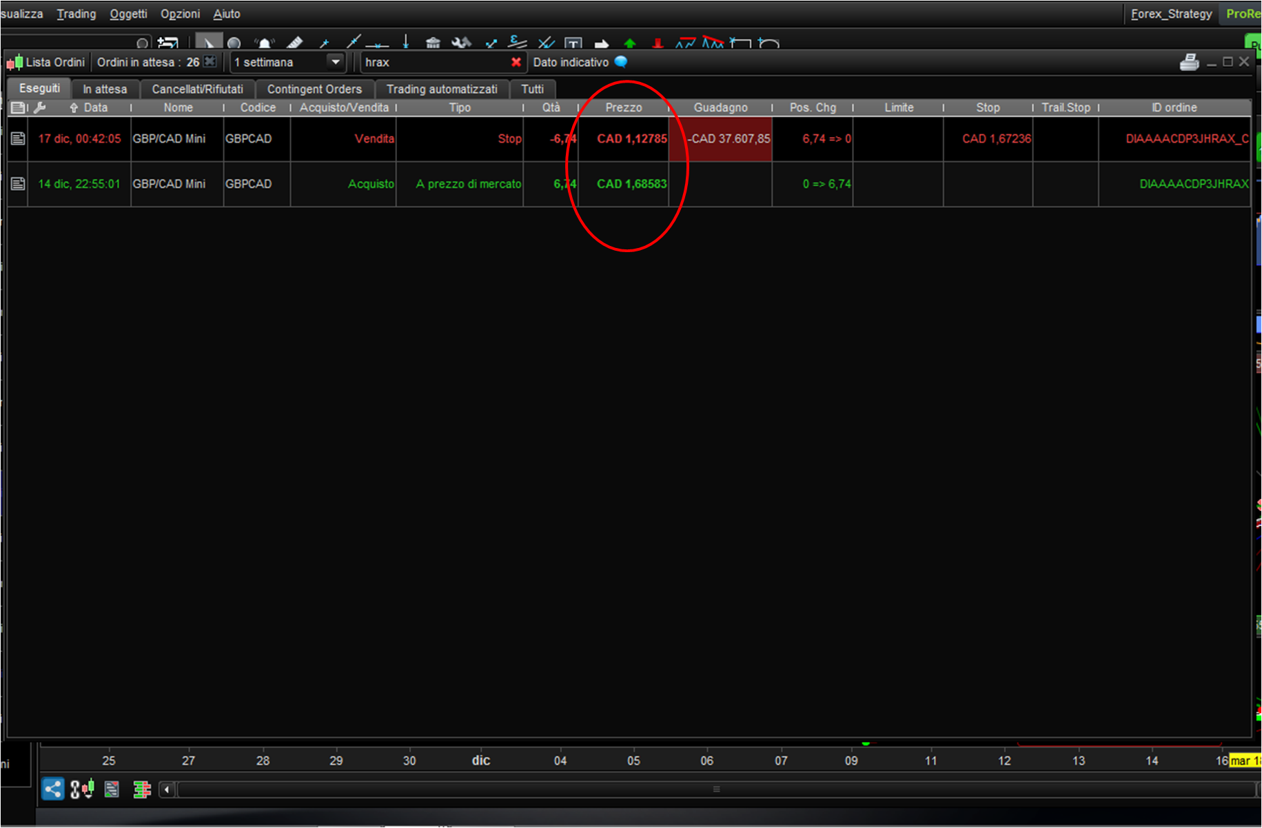 I’m testing a strategy with a PRT demo version linked to an IG demo account and something very strange happened to my trades two days ago: a trade with the pair GBPCAD opened on December 14th at the price 1.68583 has been automatically closed on December 17th at an “impossible” price of 1.12785 (see image attached). Obviously that price has never been touched during the price movement, in fact if you look at a GBPCAD chart on December 17th at 00.42 (my local time, Italy) you surely do not see such price. If my account were real I would have lost something like 37.000 CAD (about 24.000 Euro)!!!!…..Is there anyone that have similar issues?…Do you think such event could happen with a real money account?