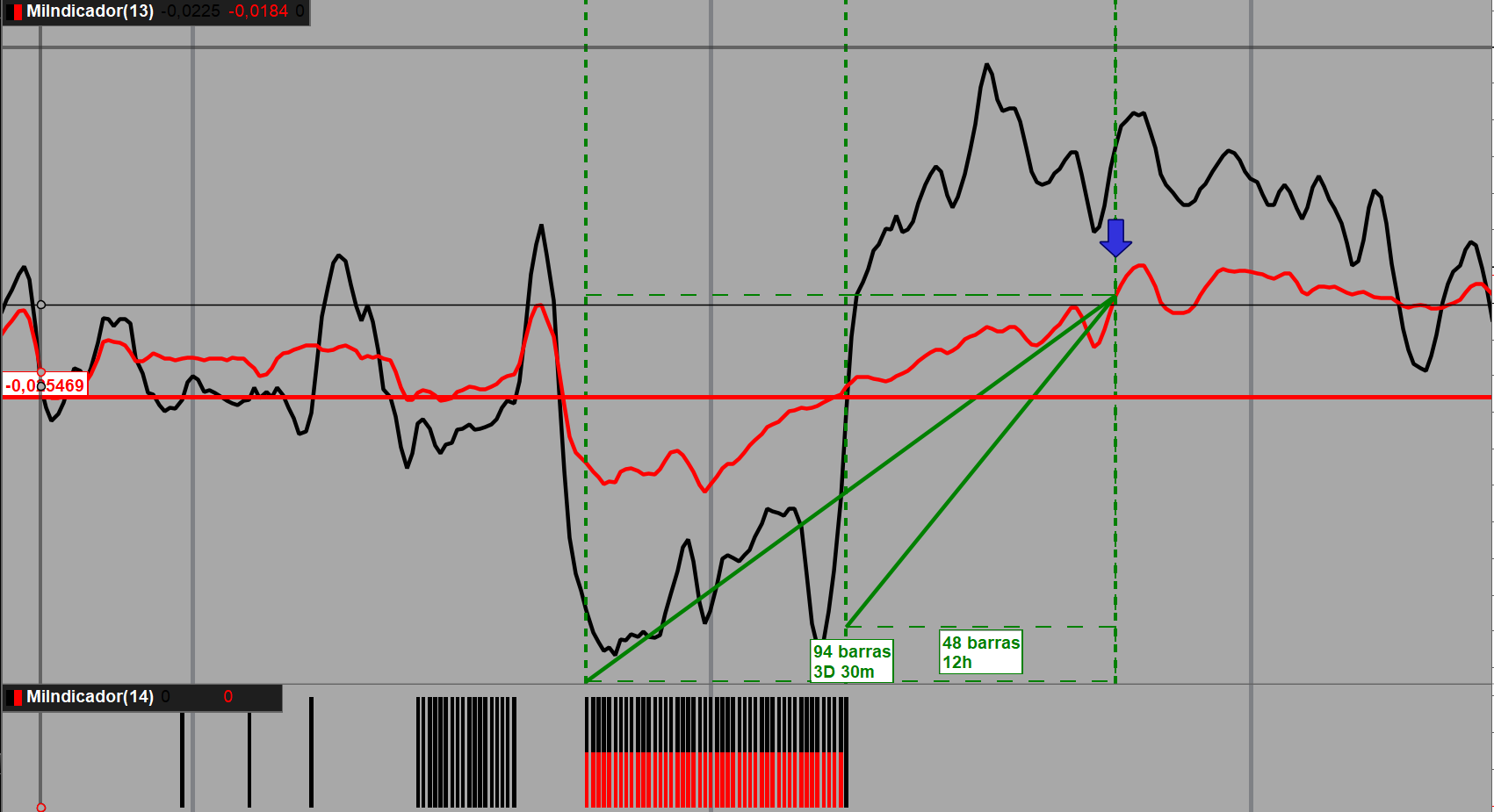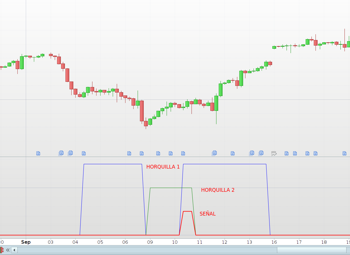 Quiero que el indicador me marque una señal cuando cumpla una condición dentro de una horquilla de validez para cada una de las condiciones previas que a su vez se encuentran también delimitadas dentro de una horquilla. La señal tendría que activarse al darse la condición a ZONA1= x>=5 and x<=175 de la primera zona y a ZONA2= x1>=45 and x2<=225 de la segunda.