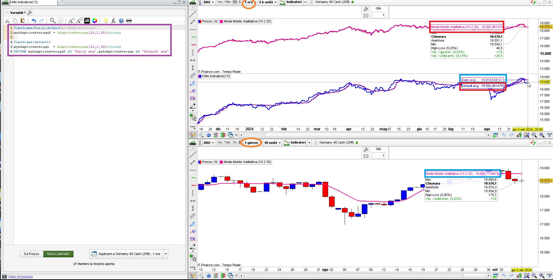 - I observed that the direct output of that AdaptiveAverage call in the higher timeframe looked very much like it was just the Close value of each higher timeframe (1min) candle