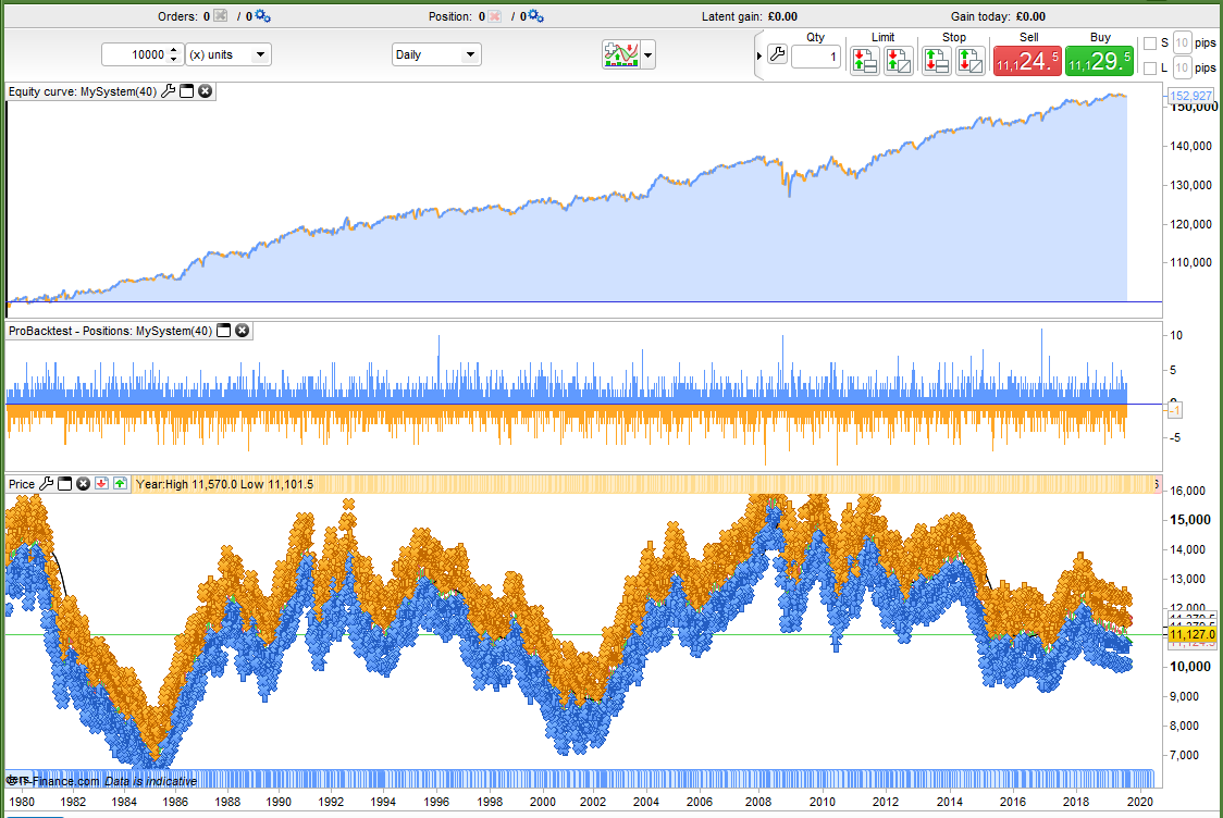 There is also an averaging down part of the code which can be turned on or off by setting ‘AverageDown’ to 1 or 0. With this turned on if we are in a trade already and it is losing and entry conditions are true again then an extra position is opened. Normally this would be a dangerous game but our maximum days allowed in the market allows us to reduce our potential risk as we can only lose as much as a market would normally move from our average price in our maximum allowed number of days (we hope!).