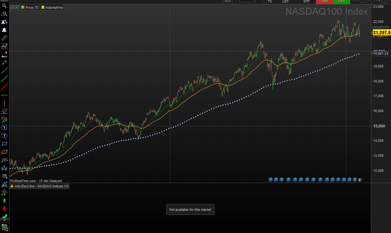 I raised this question with the people at ProRealtime and they have confirmed the way I was intending to use the Advance Decline line, isn’t the way it’s designed. I wanted to view (for example) the NDX vs its A/D line, but the way this indicator is designed, is that you view it while charting a stock in that index – so e.g., open MSFT and view the NASDAQ’s A/D line. So this is not my use case.
