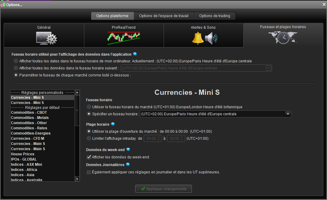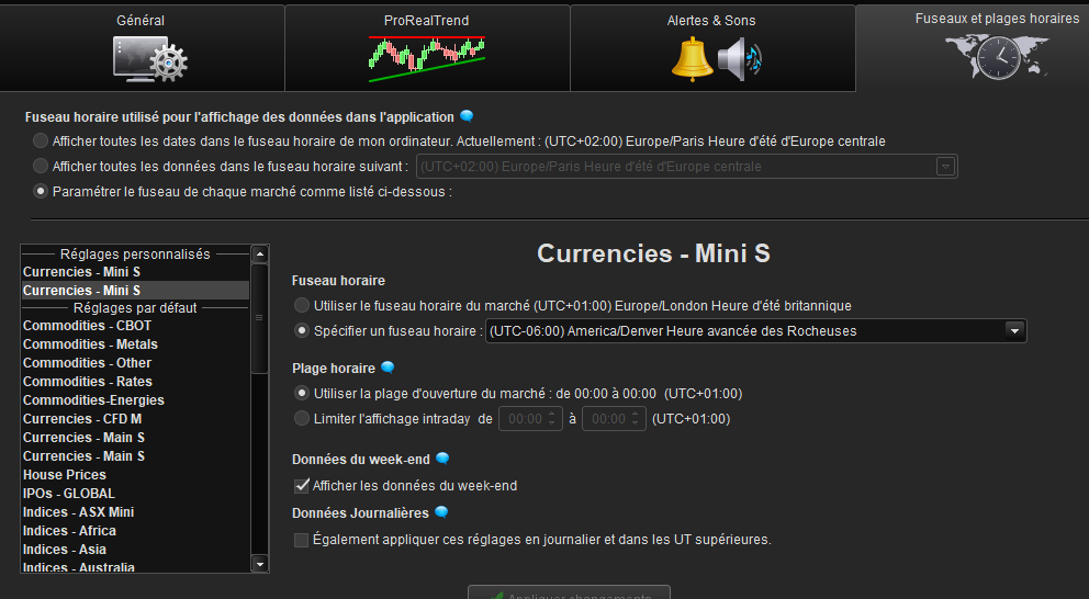 En effet, le réglage de fuseaux horaires s’appliquent à une liste d’instruments complète, et dans ce cas sur la liste “Currencies – mini S”, qui comporte ces 2 paires forex. Il n’est donc pas possible d’utiliser un fuseau horaire spécifique pour chaque instrument qui se trouve dans la même liste.