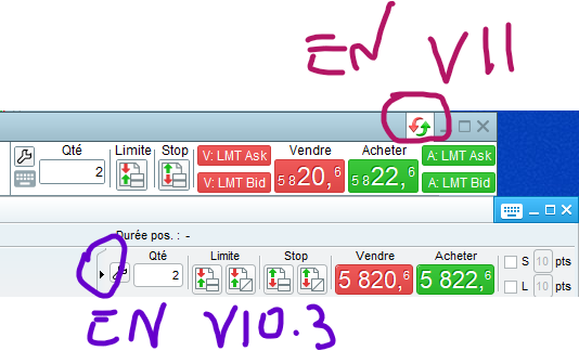 J’ai oublié de préciser au cas où, pour être complet et éventuellement faire gagner du temps à ceux qui ne s’y sont pas encore confrontés en v11, la façon de replier la barre de passages d’ordres a changé de place entre la v10.3 et la v11, ne cherchez plus la petite flèche à gauche du bandeau comme en v10.3 le bouton a migré en haut à droite et sans flèche (voir image attachée qui compare les 2)