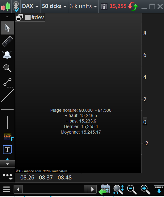 Quoiqu’il arrive – je reprécise bien mon besoin -, je ne souhaite pas un indicateur dans la zone prix ou indicateurs. Je souhaiterais créer un petit cartouche séparé (dimensionnable / déplacable) dans lequel s’afficheraient uniquement pour la case horaire prédéfinie (dans le programme) : plus haut – plus bas – clôture dernière bougie et calcul de la moyenne).