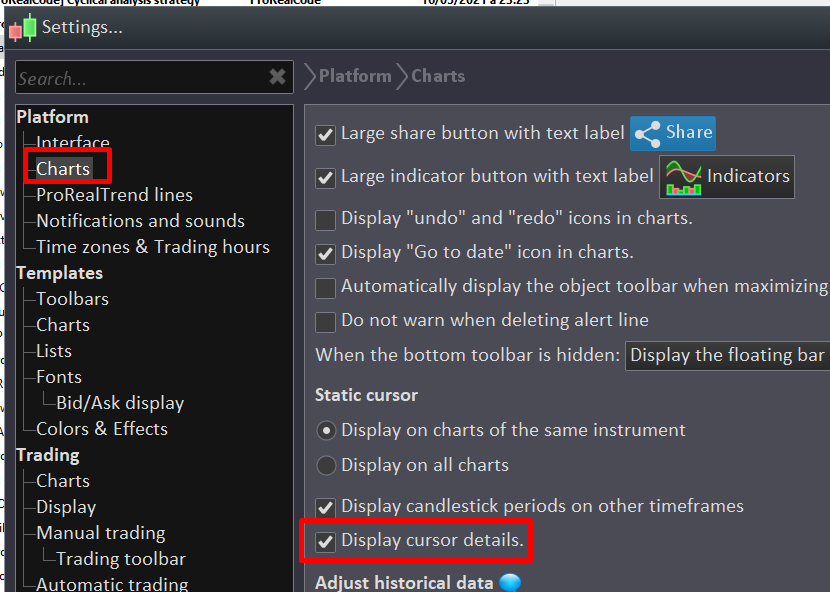 le problème est bien résolu, mais en fait, on n’y arrive pas via le panneau des réglages comme tu l’as indiqué. Il faut faire un Ctrl + D sur le graphique des prix. Le panneau des options du curseur s’affiche, et là, tu peux modifier les paramètres (vu avec service technique PRT).