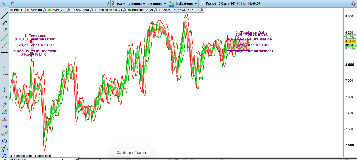 Je retrouve sur mon graphique, échelle deux heures, tout à gauche de l’image, les affichages (Draw) des paramètres Daily que j’ai récupérés avec un call.